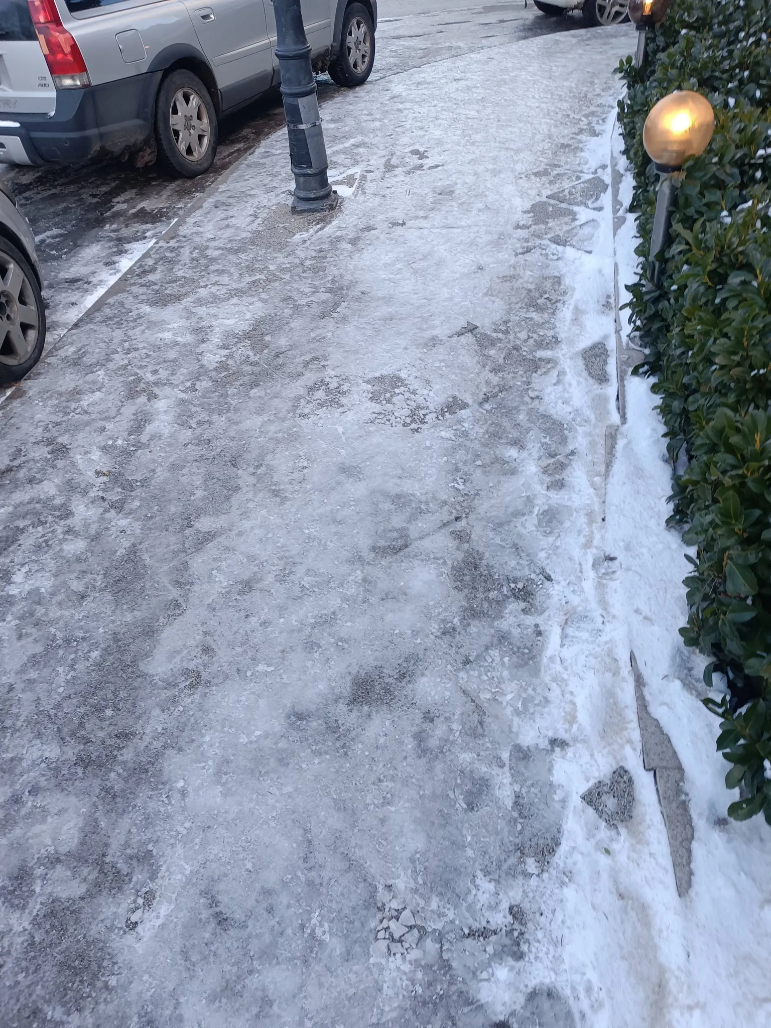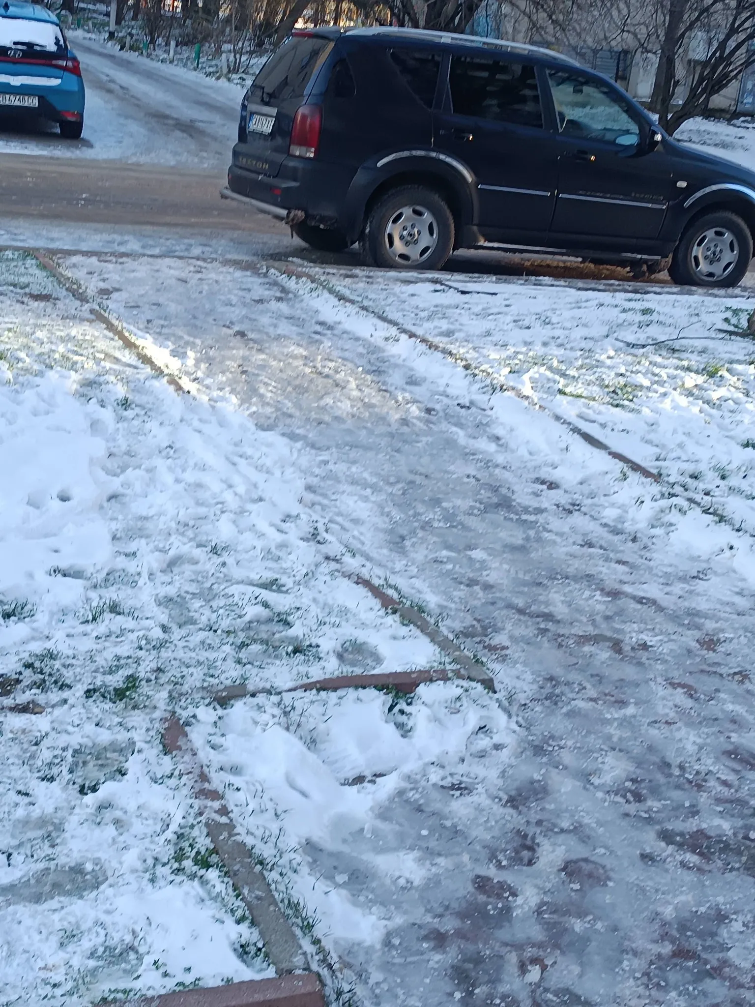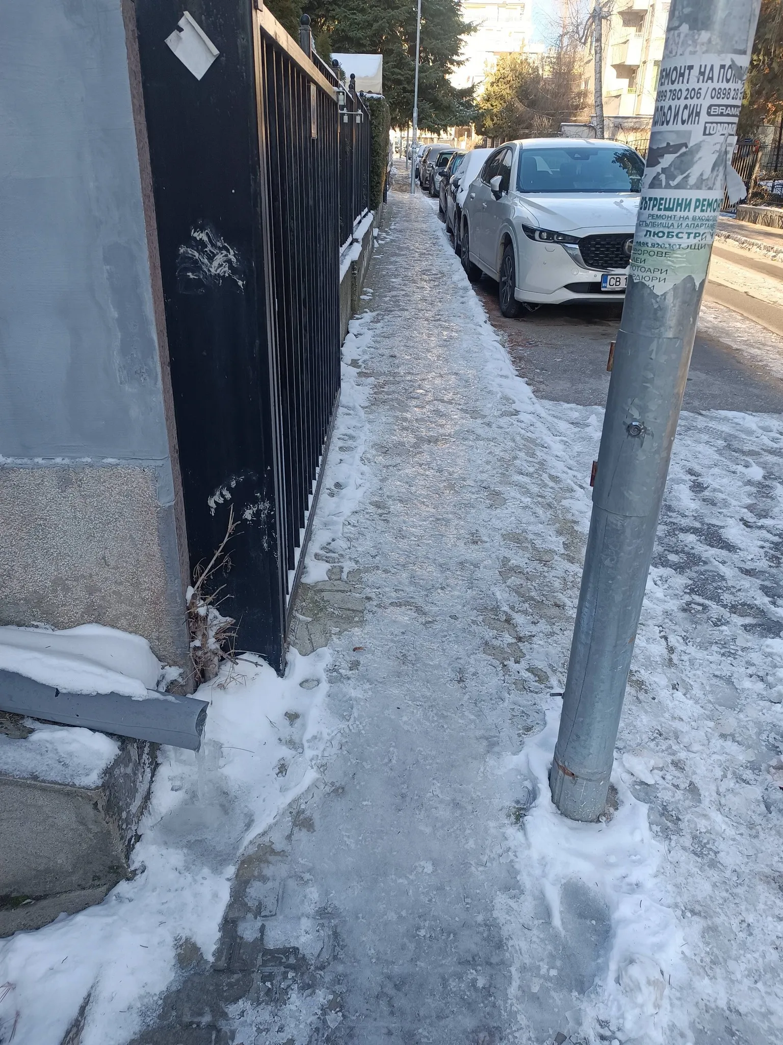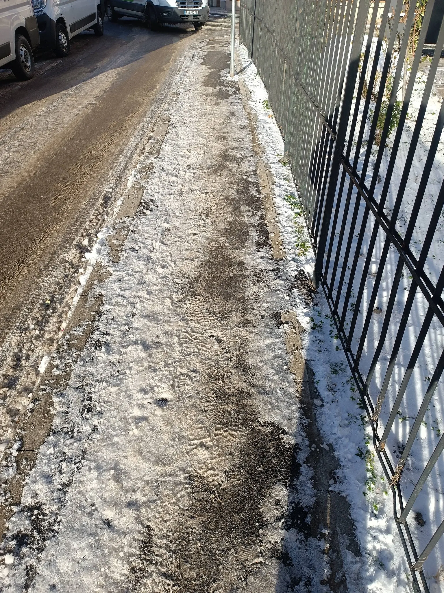 Живея на 5 минути пеша от станция на метрото, разстоянието тази сутрин го взех за двойно повече време, като на всяка стъпка правех нелекия избор между това дали да ходя по тротоара и да рискувам да се потроша, или да сляза на пътното платно, където е най-чисто, приемайки, че ако е писано да ме блъсне кола, то така е трябвало да стане, пък и може да боли по-малко.