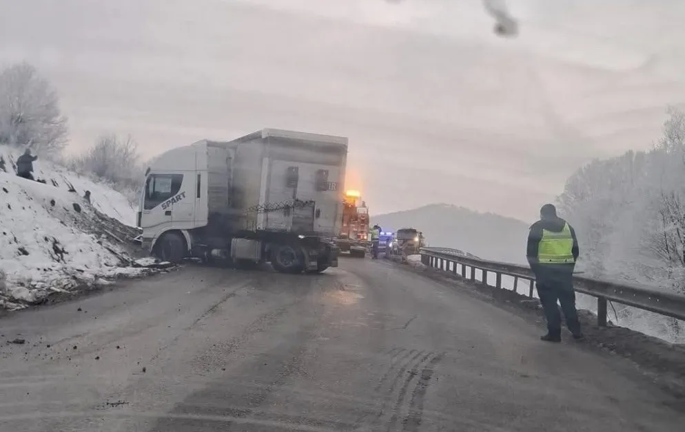 Снимки от мястото показват тежкотоварния камион, който е излязъл частично извън платното и е заседнал напречно на пътя, докато на място са пристигнали екипи на полицията.