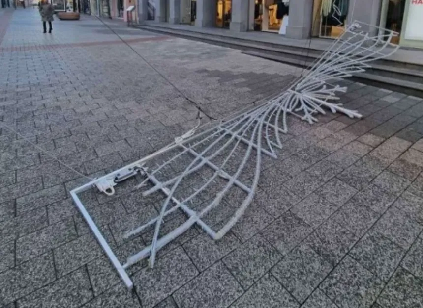 Част от празничната украса на Главната улица е паднала и препречва движението на пешеходците в сутрешните часове.