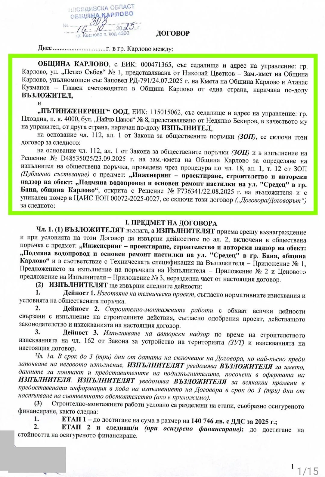 - Личната отговорност: Съгласно Чл. 32 от документа, Община Карлово е определила зам.-кмета Николай Цветков като лицето, което отговаря за пълното и точно изпълнение на договора. От сдружението питат риторично: „Къде беше контролът на г-н Цветков в петък, когато аварията беше „закърпена“ и хората бяха оставени без вода за целия уикенд?“.