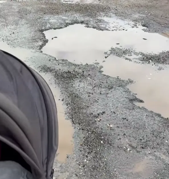 Майка с детска количка публикува видео в социалните мрежи, за да покаже в какво състояние е участък от ул. „Рига“ в Русе. Кадрите разкриват дълбоки дупки, пълни с вода, кал и чакъл, които сериозно затрудняват преминаването.