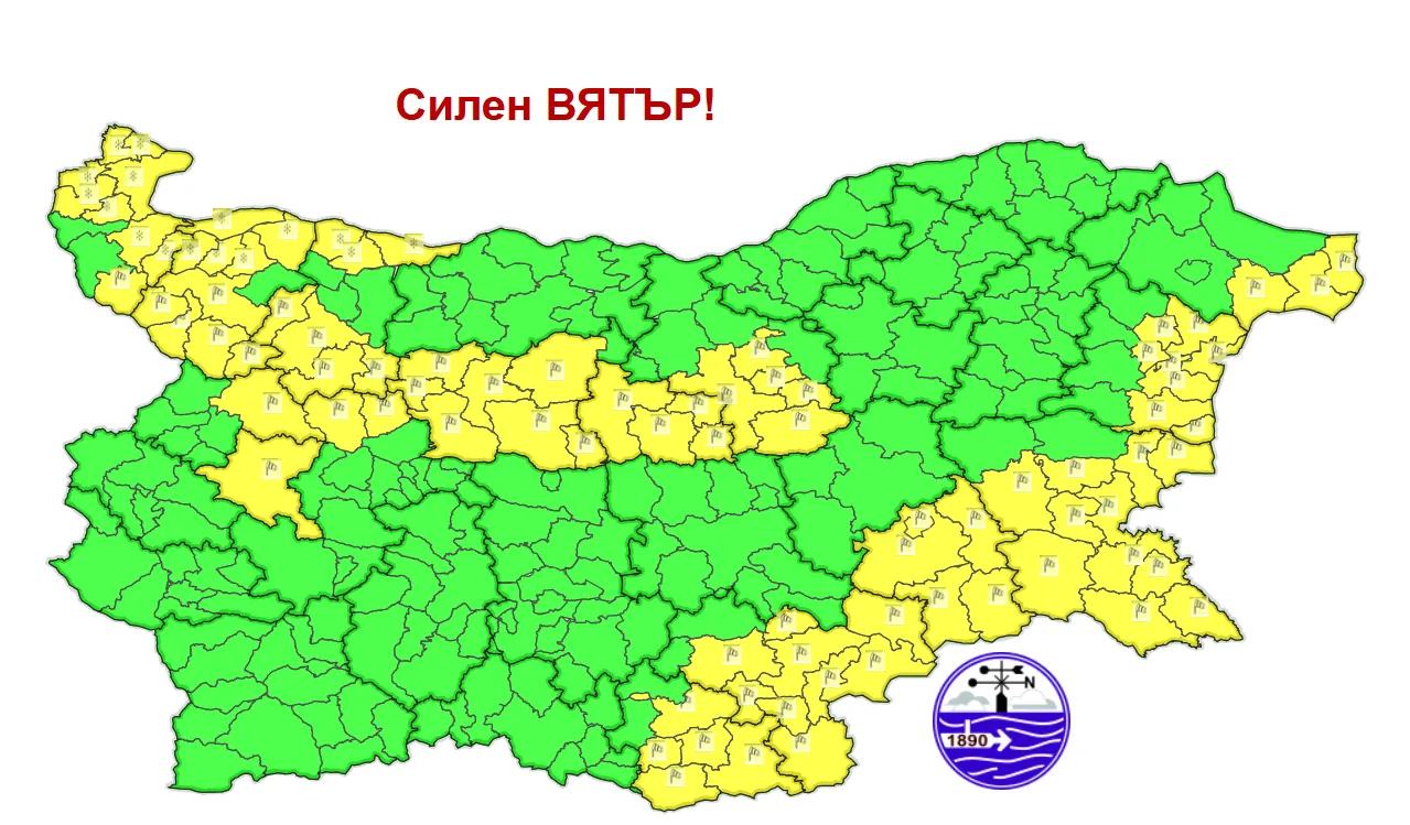 Жълт код е обявен за три области заради снеговалежи и силен вятър – Видин, Враца и Монтана. В още 11 области в Северна и Източна България за утре също е в сила жълт код, но само за силен вятър.