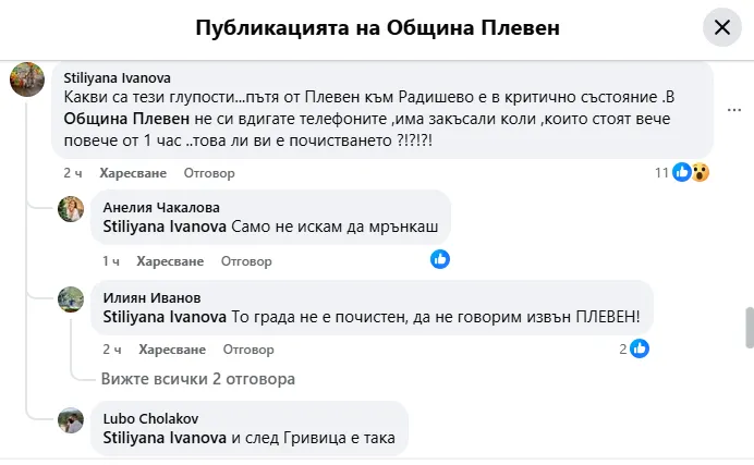 На информацията от пресцентъра на Общината жителка на Плевен, Стилияна Иванова, реагира възмутено: „Какви са тези глупости? Пътят от Плевен към Радишево е в критично състояние. В Община Плевен не си вдигате телефоните. Има закъсали коли, които стоят вече повече от 1 час. Това ли ви е почистването?“.