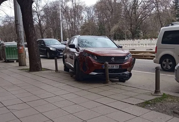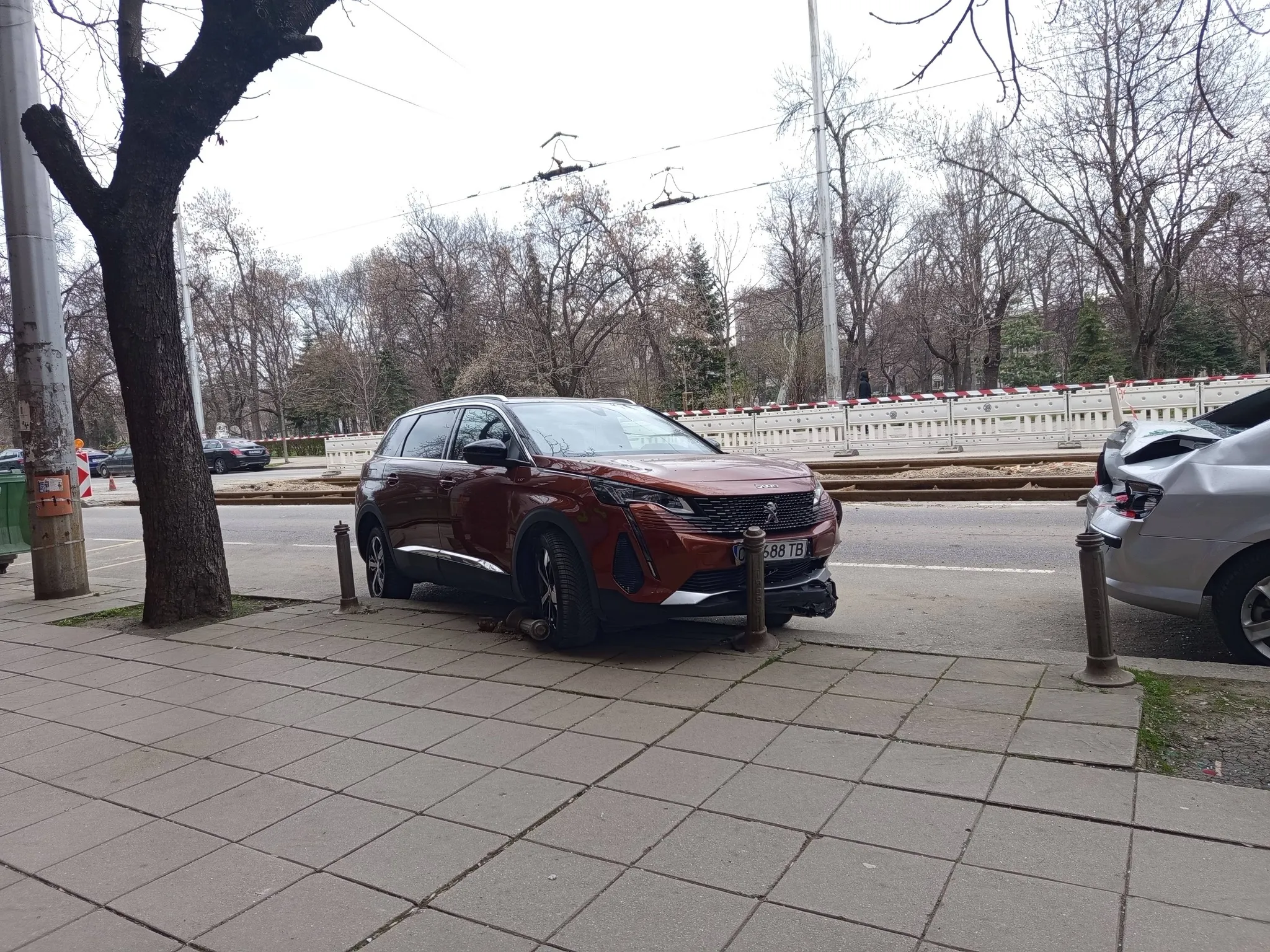 При кафявия SUV пораженията има и по предницата, и по задната част. Налице са увреждания по задния ляв калник, криво е и колелото. Ударът е бил с такава сила, че едното превозно средство е изтласкано върху тротоара, като е съборено и предпазно колче.