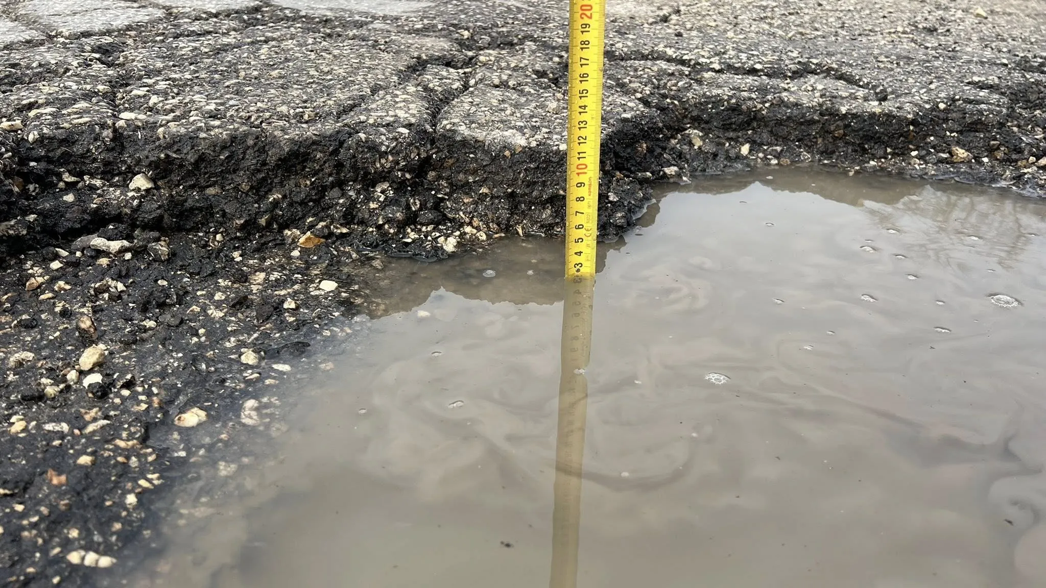 На публикувани снимки се вижда, че по колата има видими следи от удар, както и дълбока дупка, пълна с вода. По измерванията на място изглежда, че неравността е със сериозна дълбочина, което крие риск от повреди по ходовата част, гумите и джантите на преминаващите превозни средства.