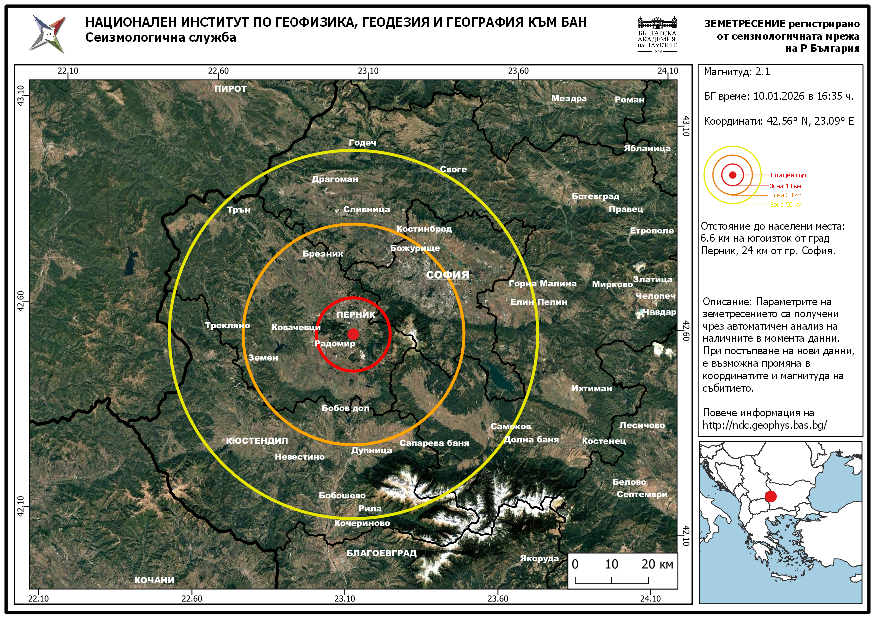 Трусът е станал в 16:35 часа днес. А епицентърът му е само на 6,6 километра от Перник и на 24 от София.