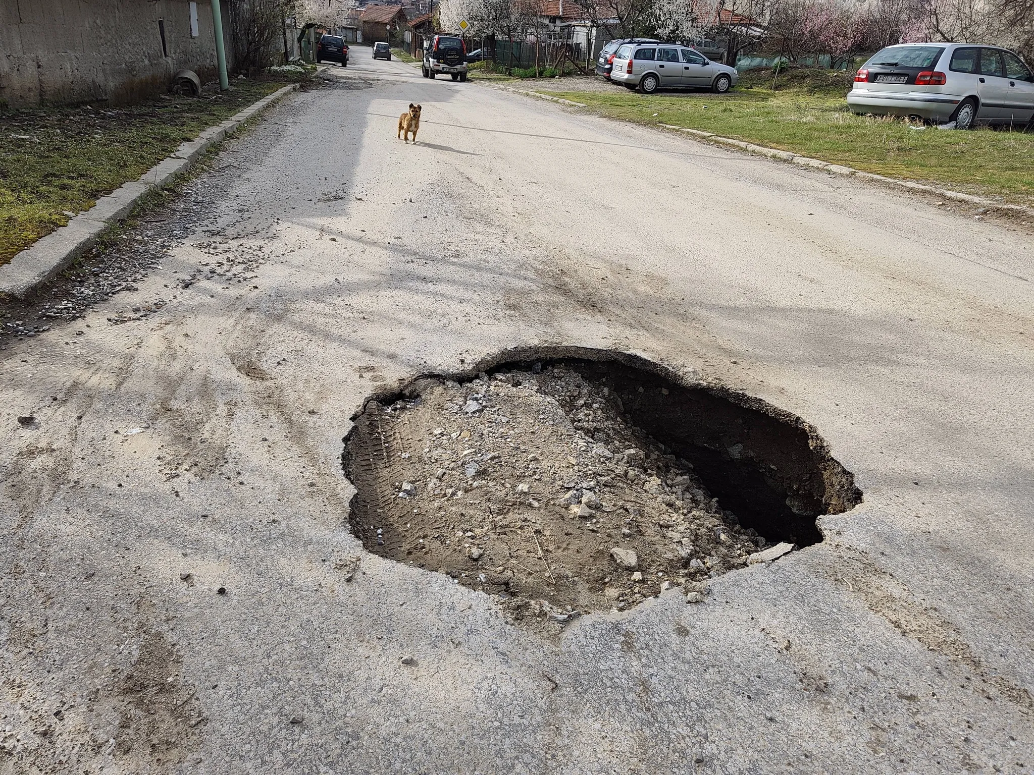 Снимките показват огромна яма, която вече е изяла част от асфалта и продължава да се разширява. Участъкът изглежда като капан, в който всеки автомобил може да попадне – особено вечер или при лоша видимост.