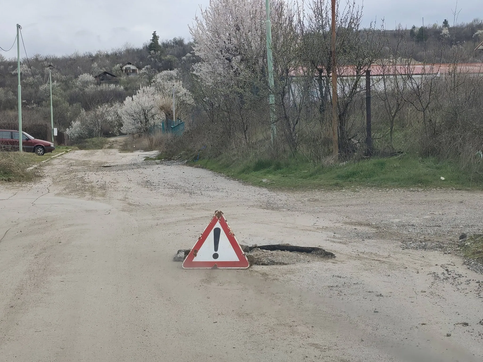 Да, просто знак, поставен точно до пропадането, сякаш това автоматично прави ситуацията безопасна. Все едно проблемът не е, че пътят се руши, а че някой може да не го забележи.