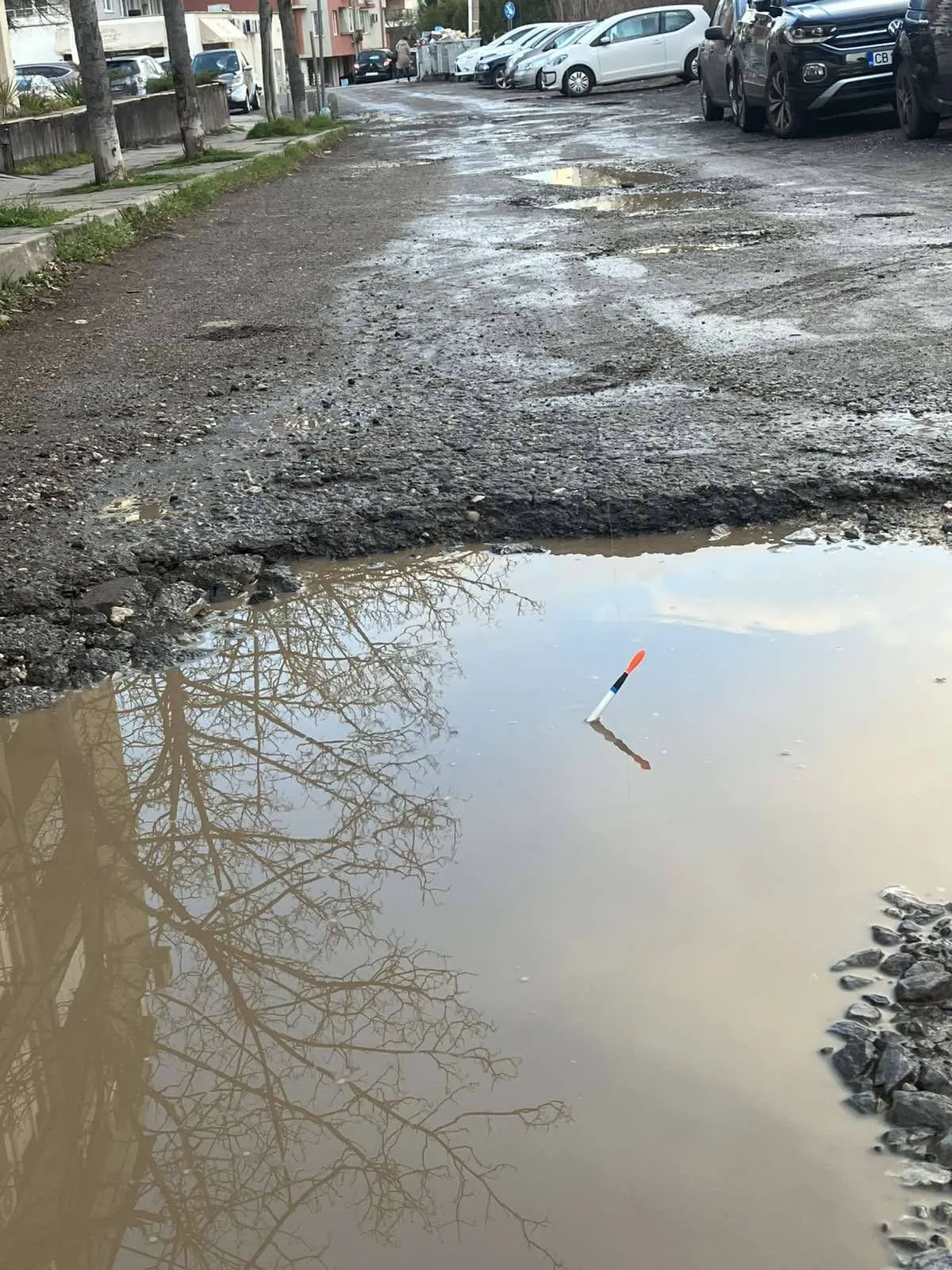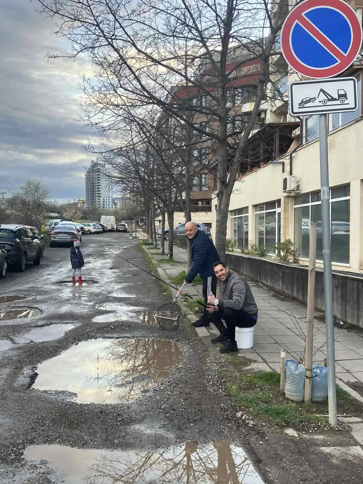 Към поста са прикрепени кадри, на които двама мъже позират до пълна с вода дупка, имитирайки риболовен излет в градска среда. Снимките веднага предизвикаха вълна от шеги в социалните мрежи.