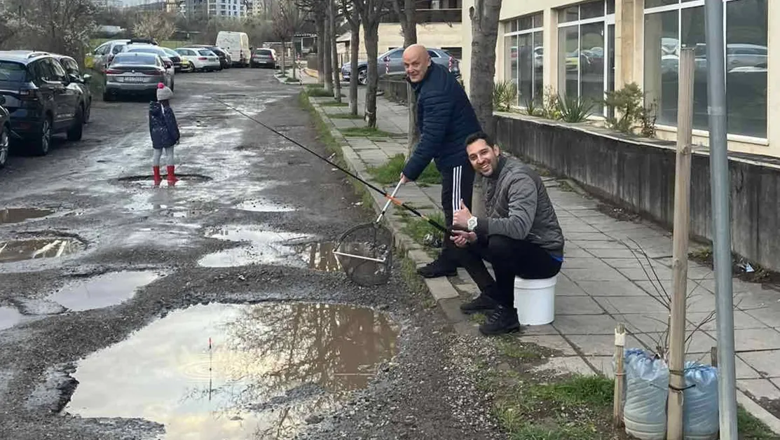 С въдица в ръка и кепче над огромна локва - така софиянци решиха да „отпразнуват“ петата година без ремонт на своята улица. Вместо поредната гневна жалба, Васил Илиев избра оръжието на иронията, за да покаже в какво се е превърнала ул. „Кукуряк“ в район „Овча купел“.