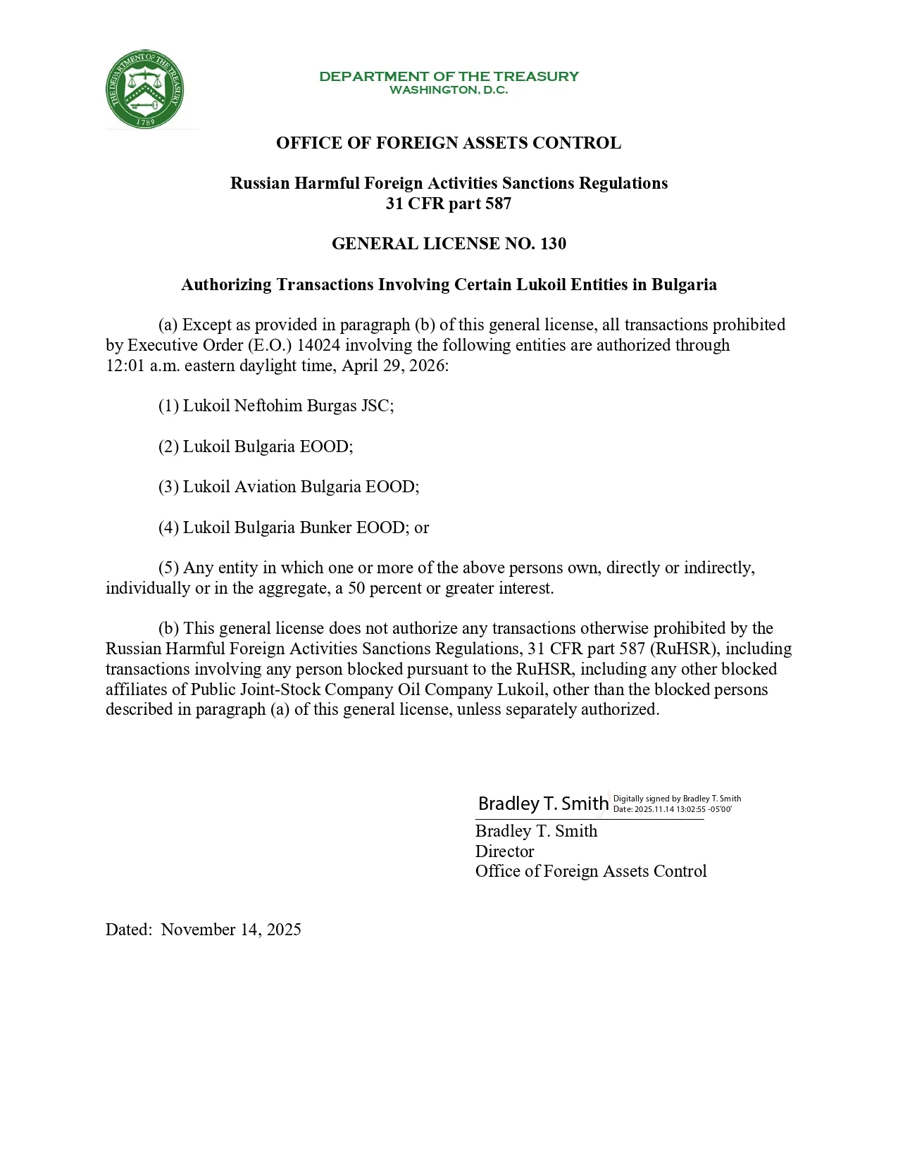 Службата за контрол на чуждестранните активи (OFAC) към Министерството на финансите издава общ лиценз № 124B, свързан с Русия – „Разрешаване на услуги в петролния сектор и други трансакции, свързани с проектите Каспийски тръбопроводен консорциум, Тенгизшевройл и Карачаганак“; общ лиценз № 128A, свързан с Русия – „Разрешаване на определени трансакции, свързани с бензиностанции на „Лукойл“ извън Русия“; общ лиценз № 130, свързан с Русия – „Разрешаване на трансакции, свързани с определени дружества на „Лукойл“ в България“; и общ лиценз № 131, свързан с Русия – „Разрешаване на определени трансакции за водене на преговори и сключване на условни договори за продажбата на „Лукойл Интернешънъл“ (Lukoil International GmbH) и свързани дейности по поддръжка“, се казва в съобщението.