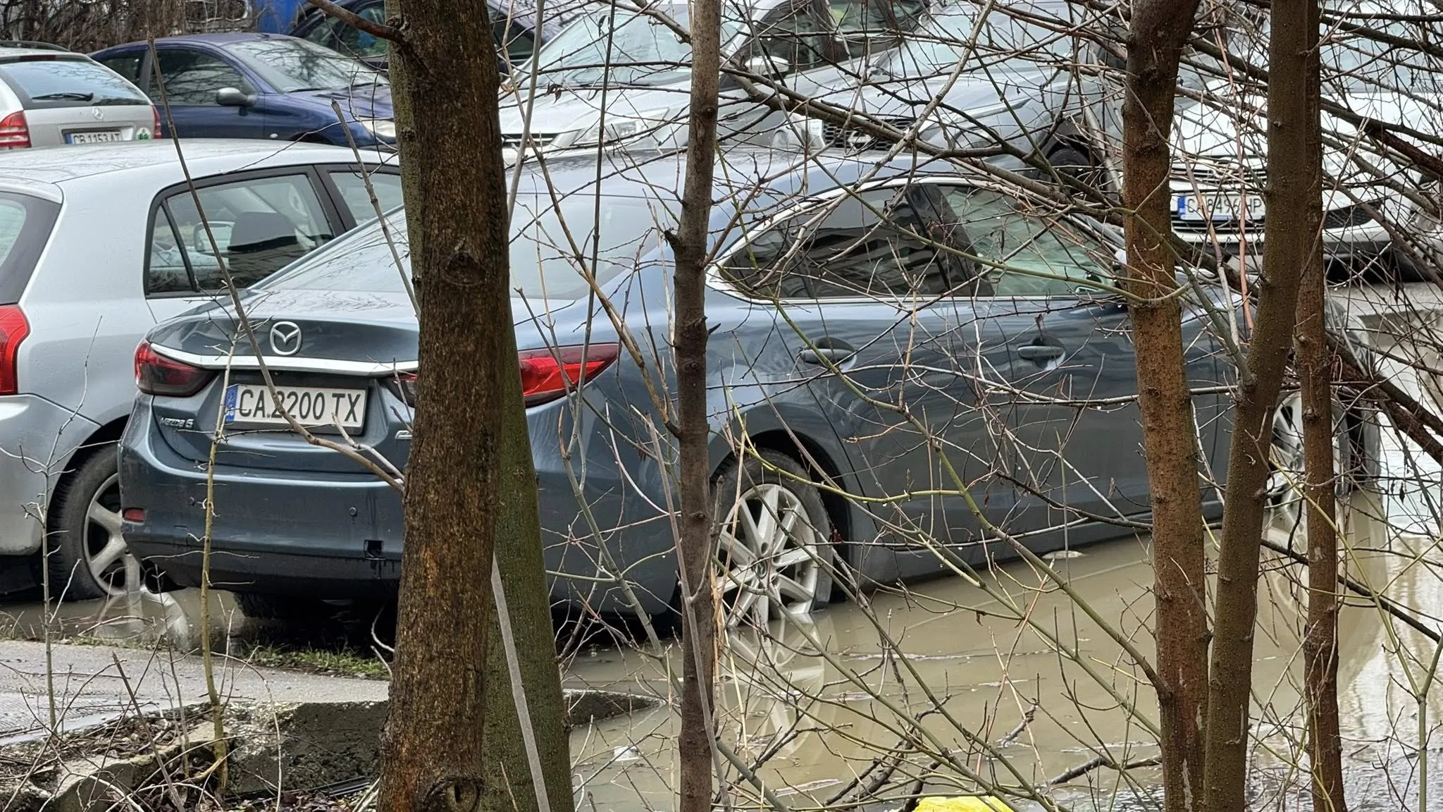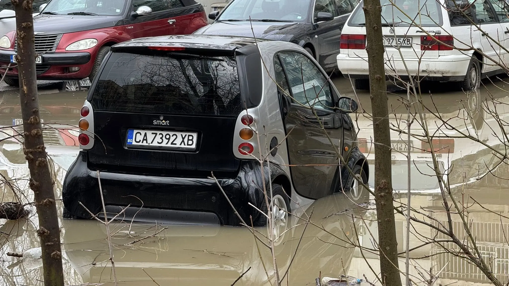 По думите на жители, водата се е събрала в значително количество, като вече е навлязла в няколко паркирани автомобила. На място се виждат коли, частично потопени във вода, а районът е трудно проходим. Дървета и храсти са заобиколени от кална вода, което допълнително показва мащаба на проблема.