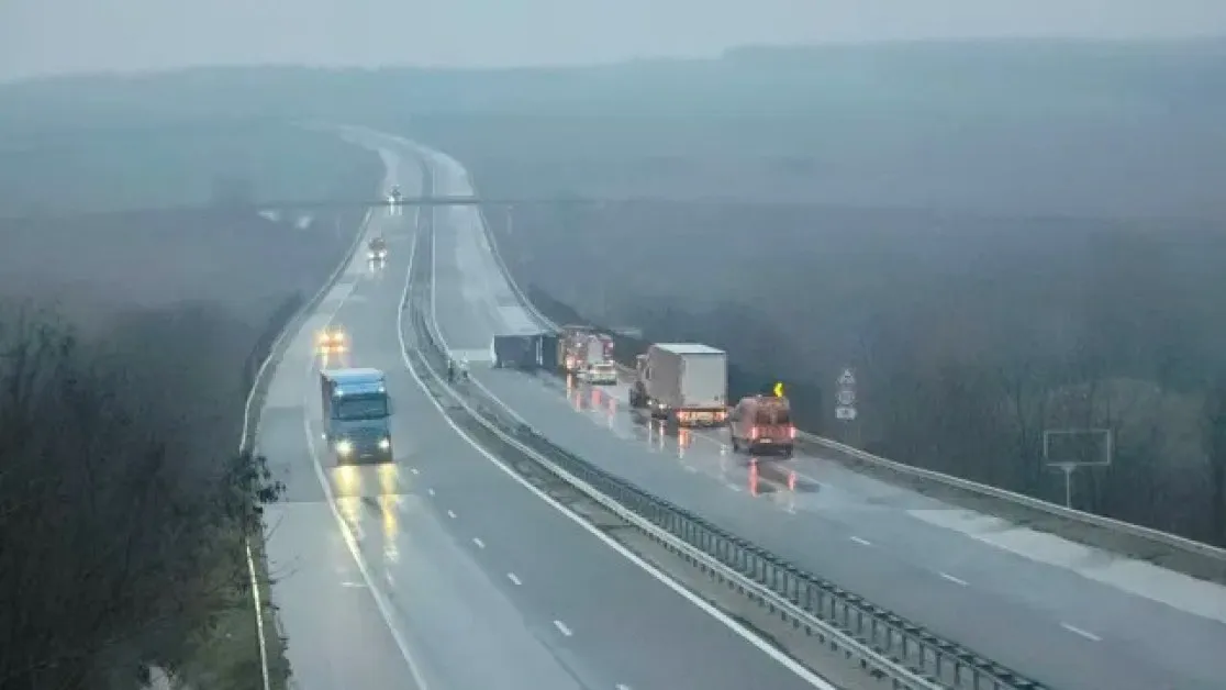 Чака се техника, която да вдигне камиона от пътното платно. Дотогава участъкът от магистралата остава затворен.