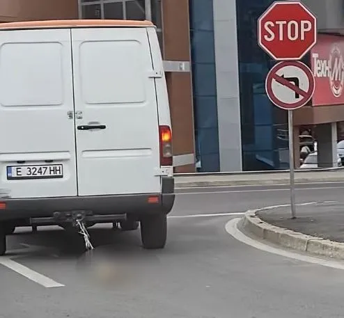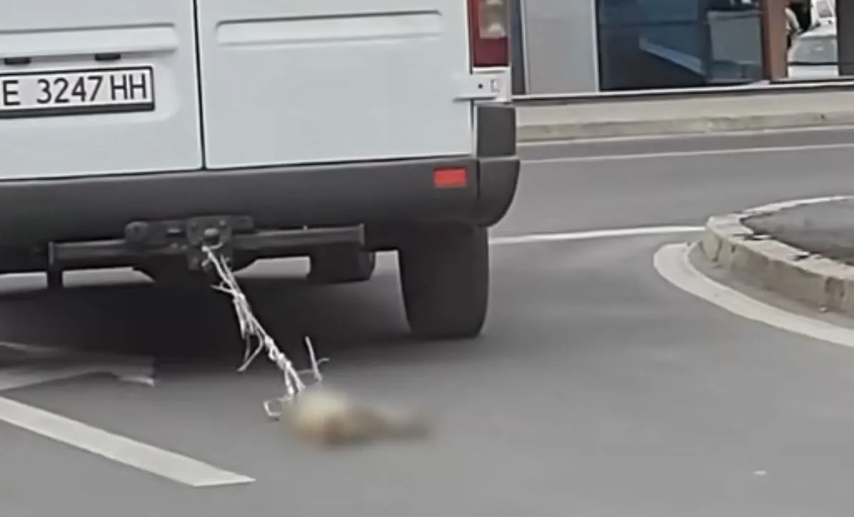 На запис, разпространен във Facebook на 2 април, се вижда бял бус с благоевградски номера, за който с въже е завързано малко телце, прилично на труп на котка.