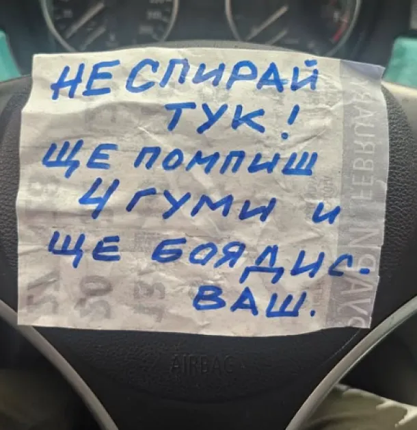 На листа ясно се чете: „Не спирай тук! Ще помпиш 4 гуми и ще боядисваш.“ Посланието бързо се разпространи онлайн, след като собственикът на колата го сподели с апел за диалог.