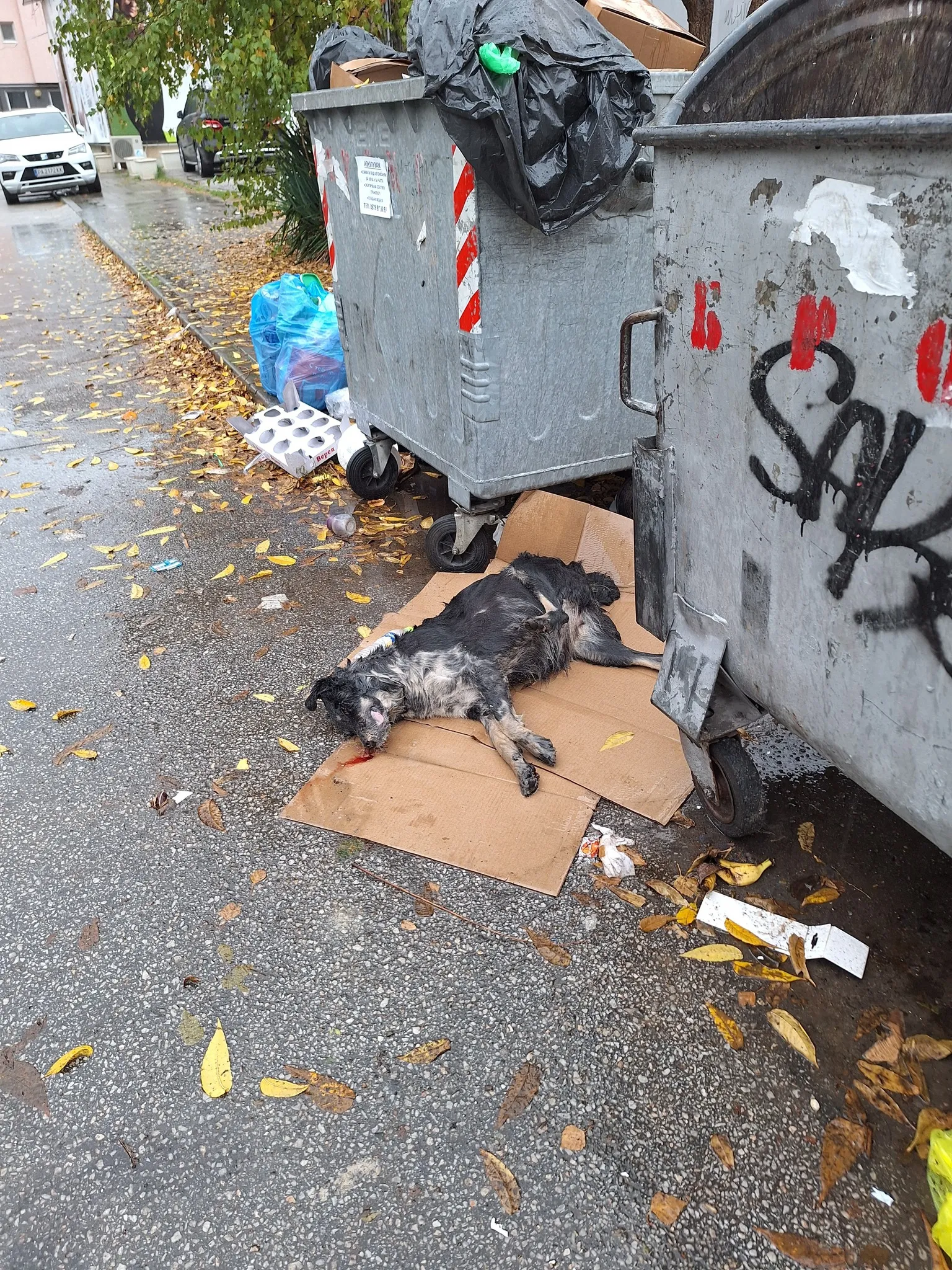 Ден по-късно, на 27 октомври, Рогова публикува нова снимка, на която се вижда, че трупът на кучето е преместен... до контейнери за боклук.