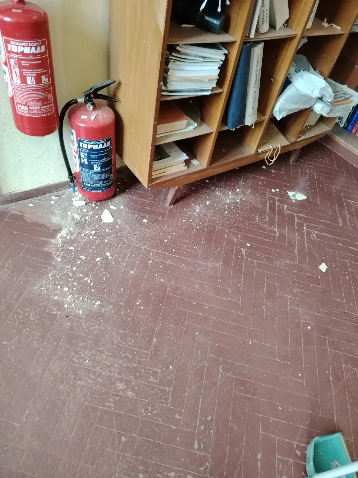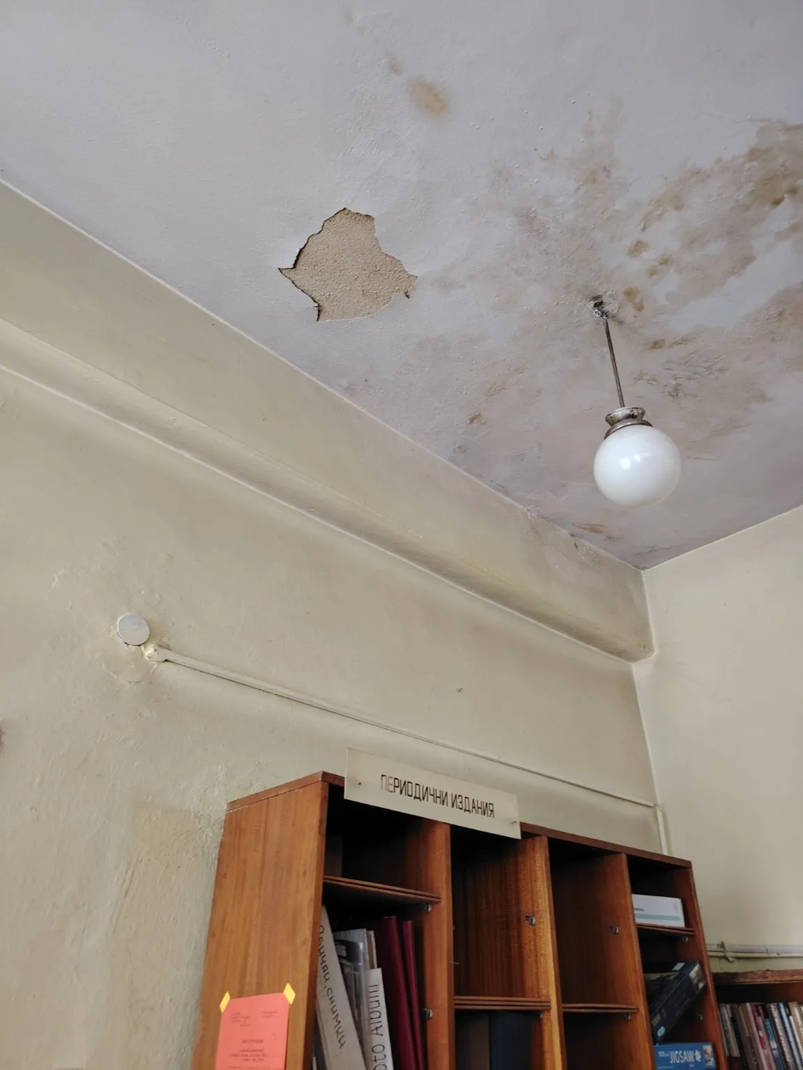 Според описанието на Илиева, покривът на културната институция е силно повреден, като на много места има дупки. Това води до постоянни течове, влага и падаща мазилка в помещенията.