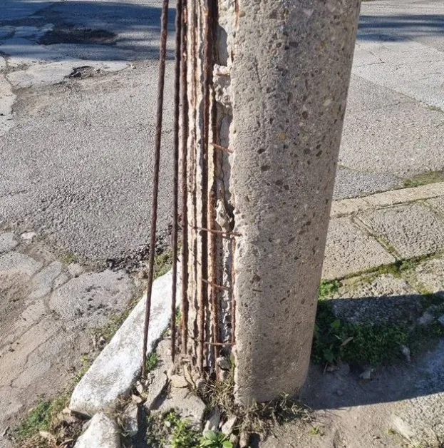 По думите на Владимир Димов, който споделя изображенията, проблемният стълб се намира „на ъгъла на ул. Братя Миладинови и ул. Яне Сандански“. Видимо е, че голяма част от бетоновата основа е разрушена, а на места арматурата е напълно оголена — състояние, което поставя под съмнение стабилността на съоръжението.