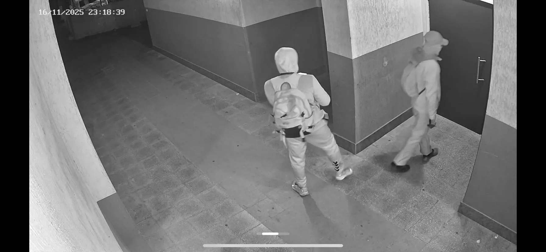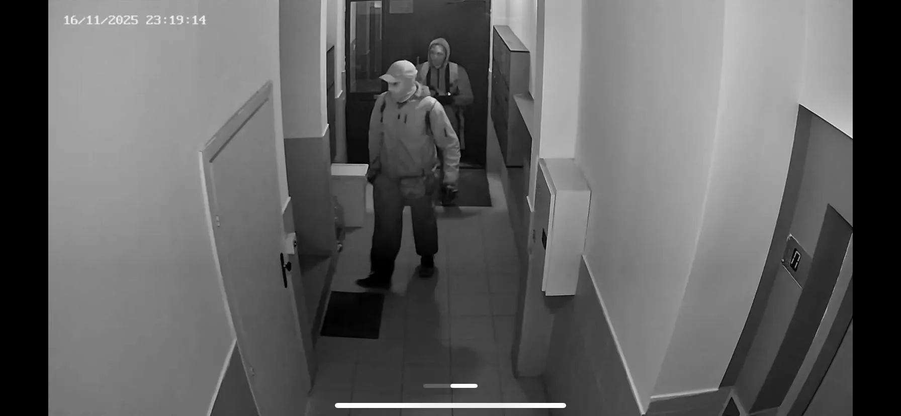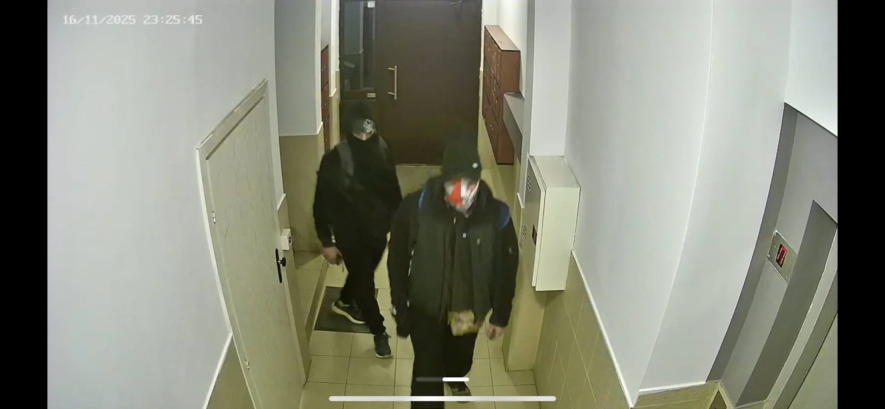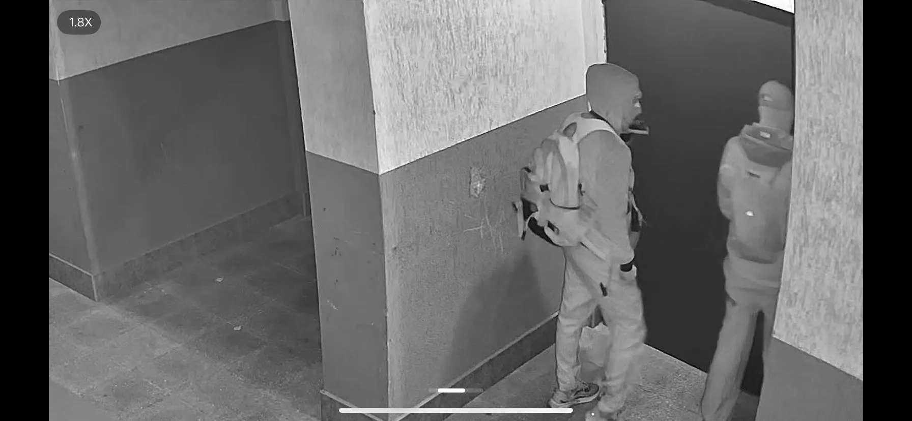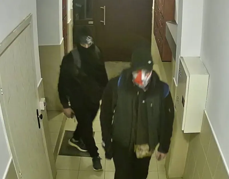 На публикуваните кадри се виждат двама мъже с качулки, шапки и раници, които влизат във входове и се оглеждат. Носят черни дрехи, раници и маски, които закриват лицата им.