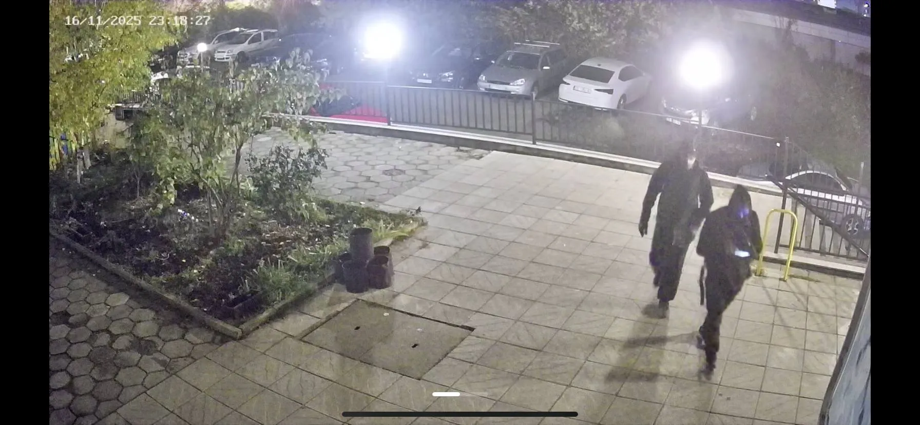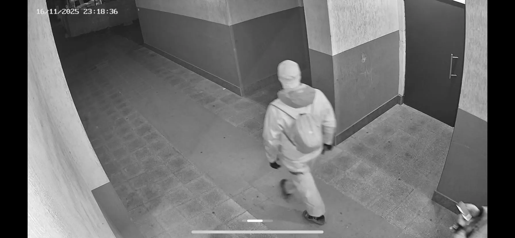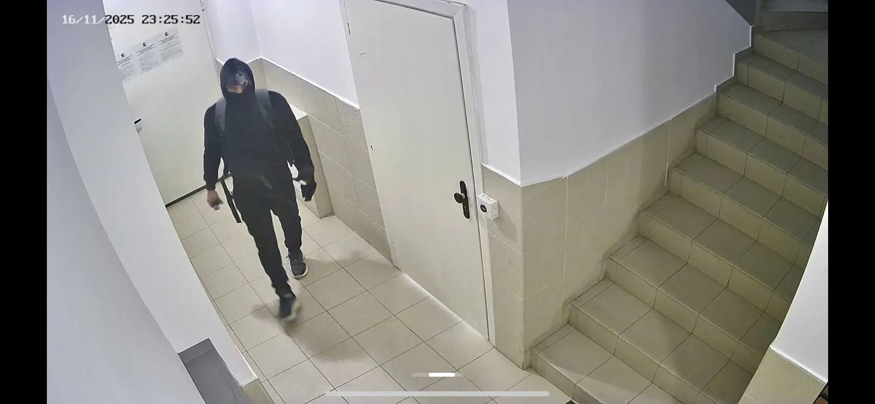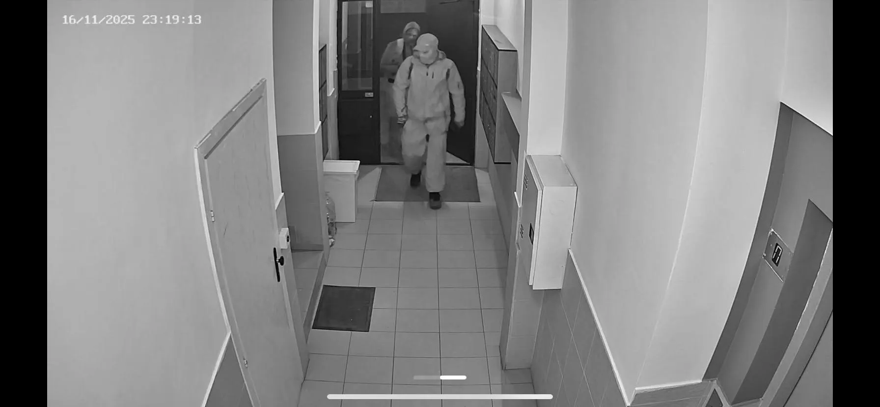 На публикуваните кадри се виждат двама мъже с качулки, шапки и раници, които влизат във входове и се оглеждат. Носят черни дрехи, раници и маски, които закриват лицата им.