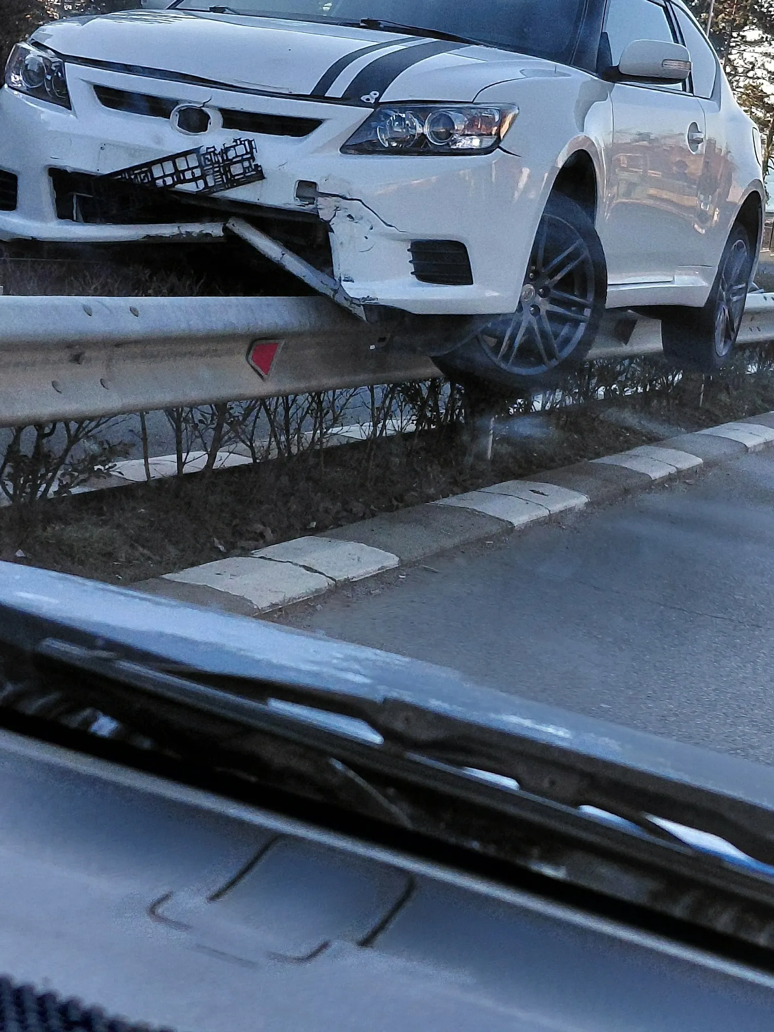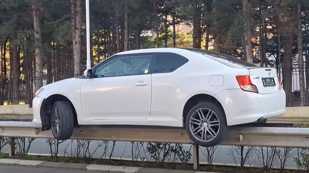 Странен пътен инцидент е станал днес на отсечката между Слънчев бряг и Свети Влас, където лек автомобил е „кацнал“ върху разделителните мантинели. Снимки от мястото показват колата, балансираща върху металната ограда, с видими щети по предната част.