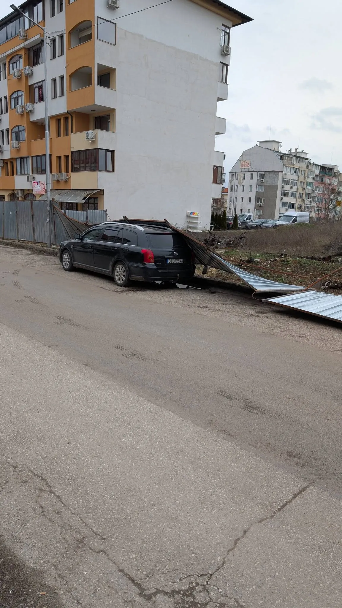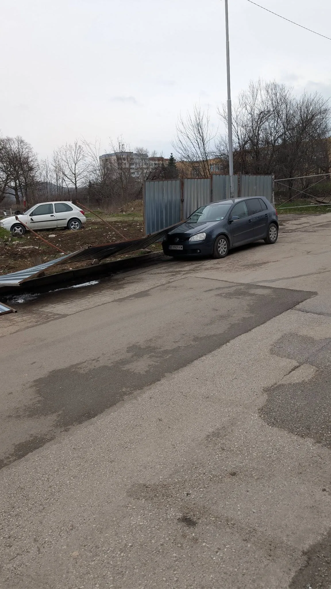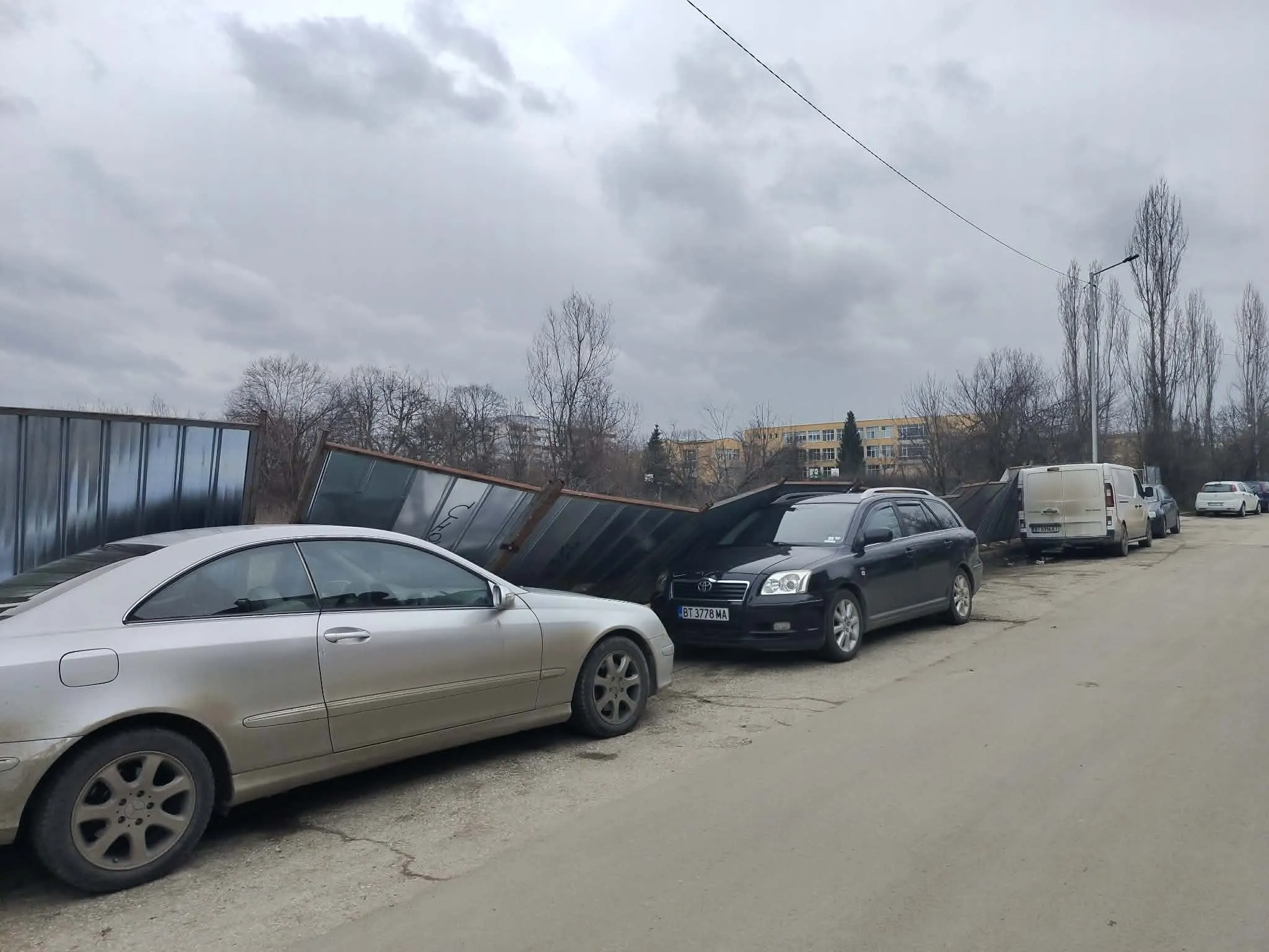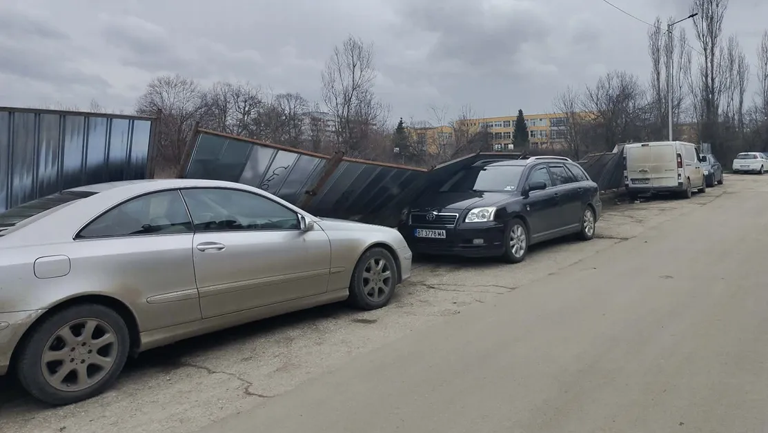 Жители на Велико Търново алармират в социалните мрежи за инцидент, при който строителна ограда е паднала върху няколко паркирани автомобила в ж.к. „Бузлуджа“.