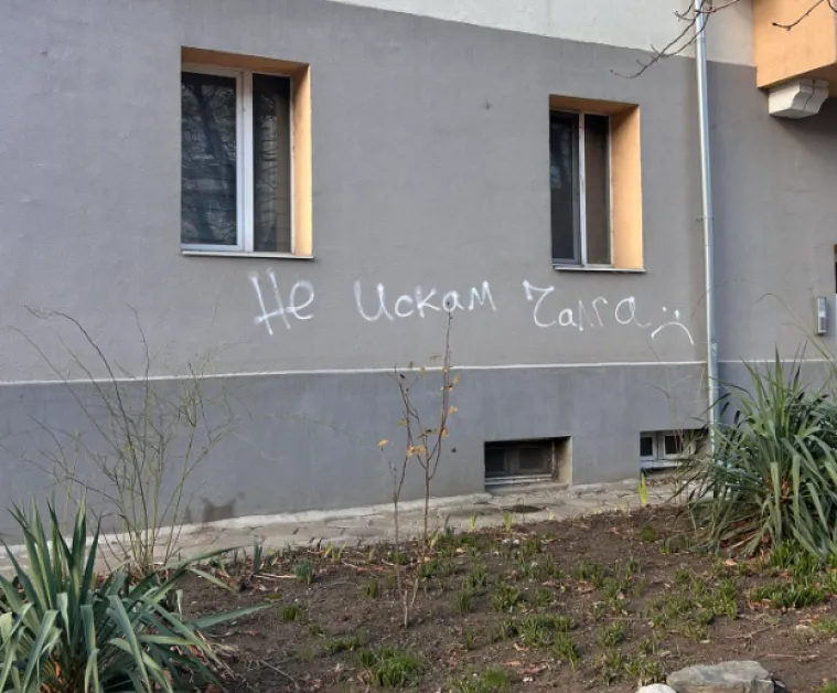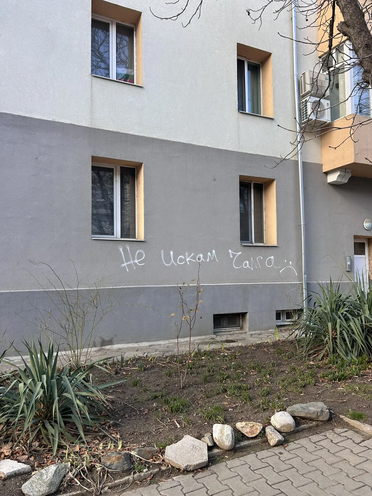 Драсканица върху фасада на жилищен блок в Благоевград предизвика коментари в социалните мрежи, след като жителка на града публикува снимка и изрази възмущението си от начина, по който е „защитено“ лично мнение.