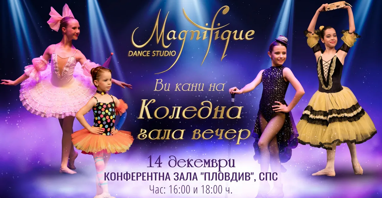 На 14 декември, неделя, танцово студио DS Magnifique отправя покана към всички ценители на изкуството да се потопят в магията на своята Коледна гала вечер. Тази година, за да зарадва максимално публиката, събитието ще се проведе в два последователни концерта – от 16:00 и от 18:00 часа, в зала „Пловдив" на хотел SPS. Организатор на празничния ден е Нора Маршаха, а водещ ще бъде Ася Антонова.