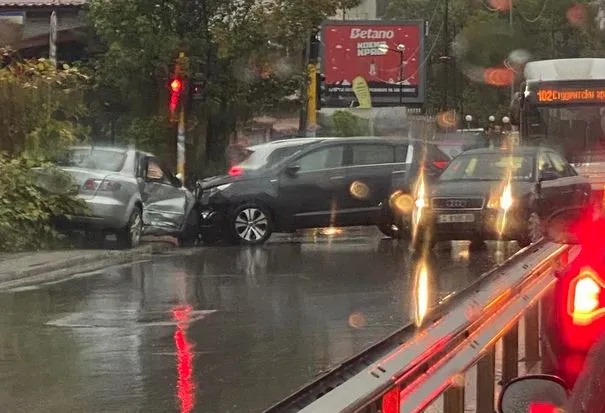 Две коли са се блъснали на "Симеоновско шосе". Едната машина има следи от сериозен страничен удар. Движението в участъка е затруднено. Към момента няма данни за пострадали.