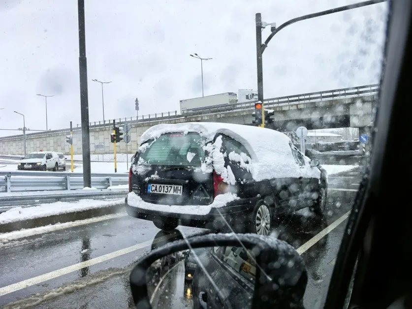 От снимката се вижда, че задното стъкло и част от страничните прозорци на автомобила са покрити със сняг, което сериозно ограничава видимостта на водача. Освен риск за останалите участници в движението, натрупаният сняг по покрива може да се свлече при спиране или по време на движение и да създаде допълнителна опасност.