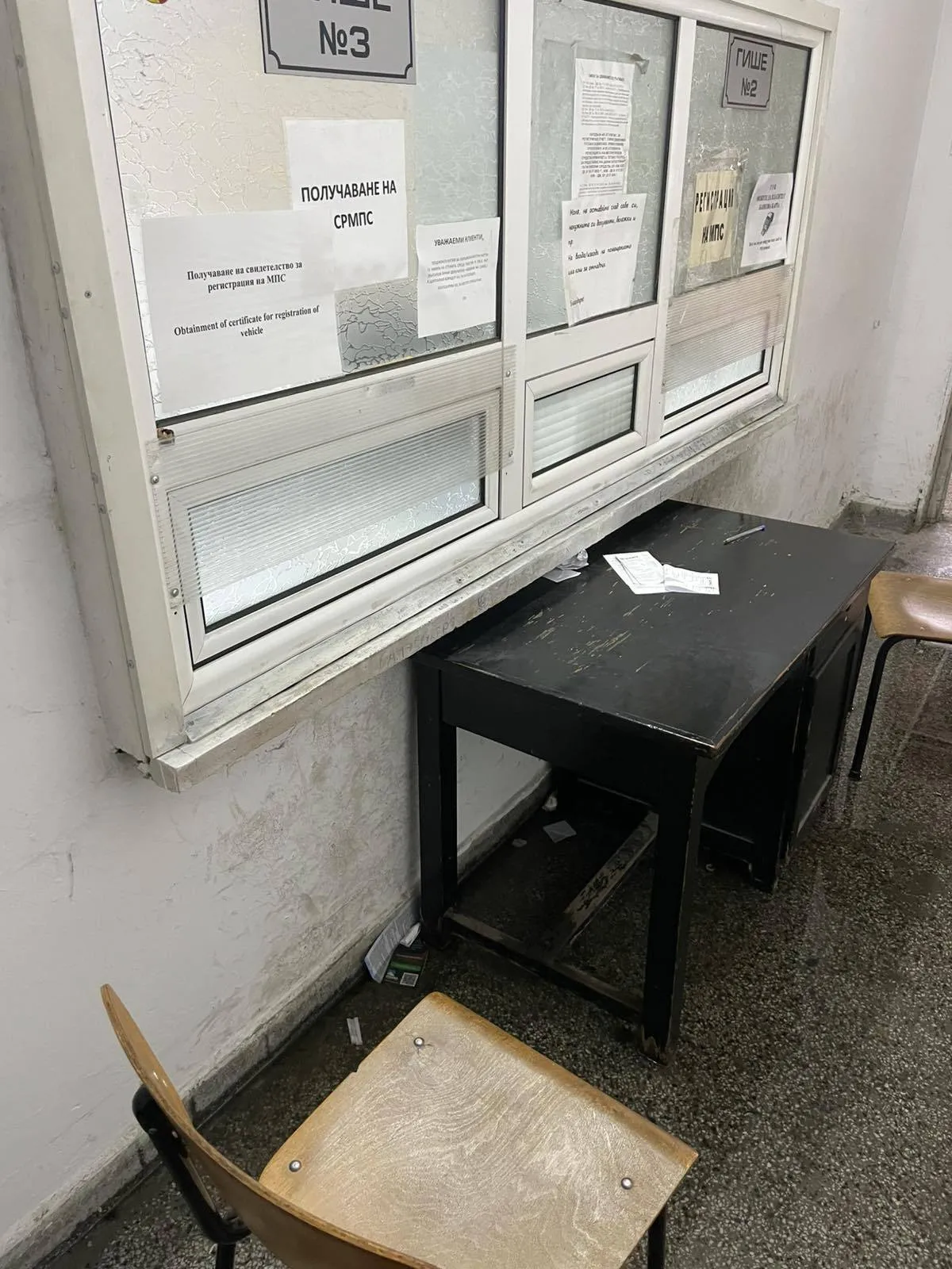 Помещението - или по-скоро тясното коридорче - в което гражданите трябва да попълват документи и да чакат за регистрация на МПС в КАТ-Благоевград, тъне в разруха. Снимки, публикувани във Фейсбук на 21 ноември от човек, пожелал да остане анонимен, показват шокиращата реалност: изцапани стени, два неудобни стола, маса като от миналия век, наводнен под.