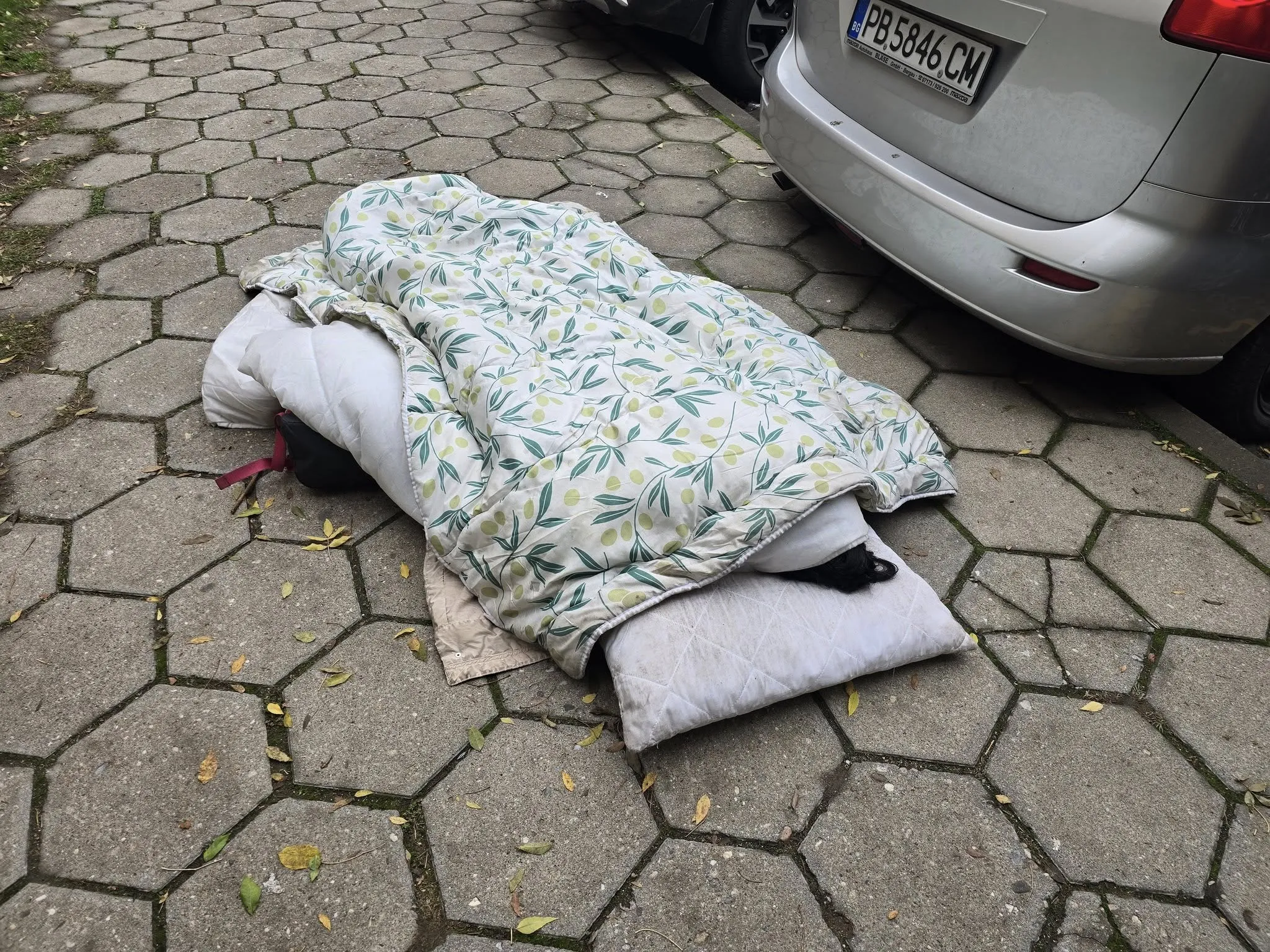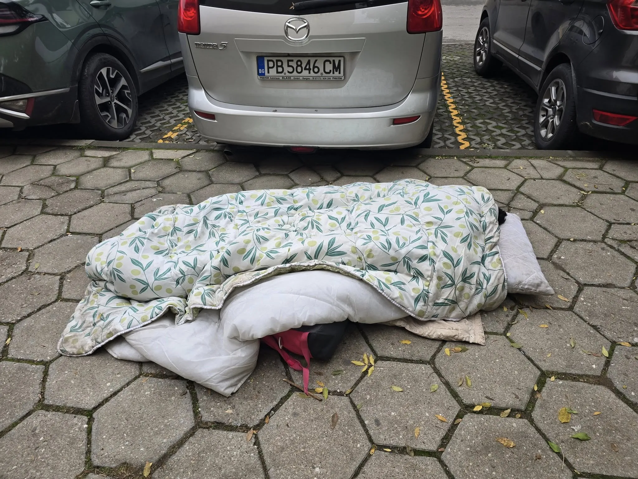 В двора на Университетска многопрофилна болница „Пълмед“ в Пловдив Минчо Ганчев заварил спящ човек - той бил „настанен“ на тротоара, завит с юргани.