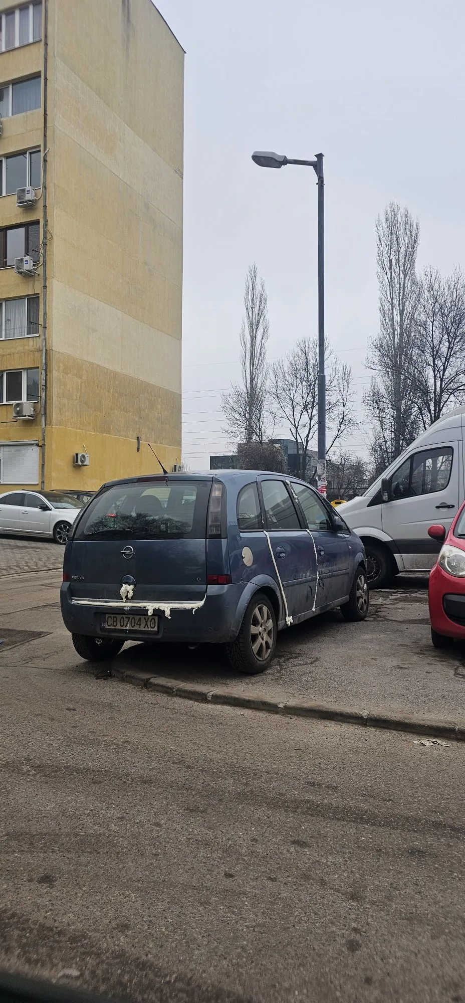 По кадъра се вижда, че процепи на колата са запълнени с монтажна пяна – по вратите и багажника ясно личат следи от втвърдения материал. Подобен способ е използван и в други случаи през последните години, като нанася значителни щети по боята и уплътненията на автомобила, а почистването често изисква сериозен ремонт.
