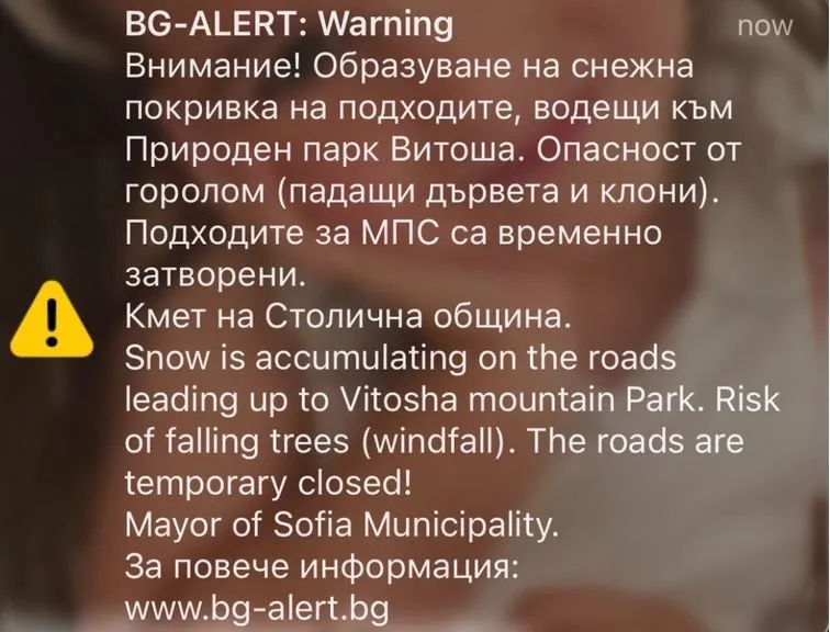 Системата BG-Alert беше активирана в петък сутринта за жителите на София заради натрупана снежна покривка по подходите към Природен парк „Витоша“.