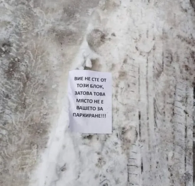 Поредният конфликт около паркирането в Велико Търново предизвика вълна от коментари в социалните мрежи. Мъж публикува снимка на бележка, оставена върху автомобил, на която е изписано: „Вие не сте от този блок, затова това място не е вашето за паркиране!!!“. Към кадъра авторът иронично добавя: „да си знаете“.