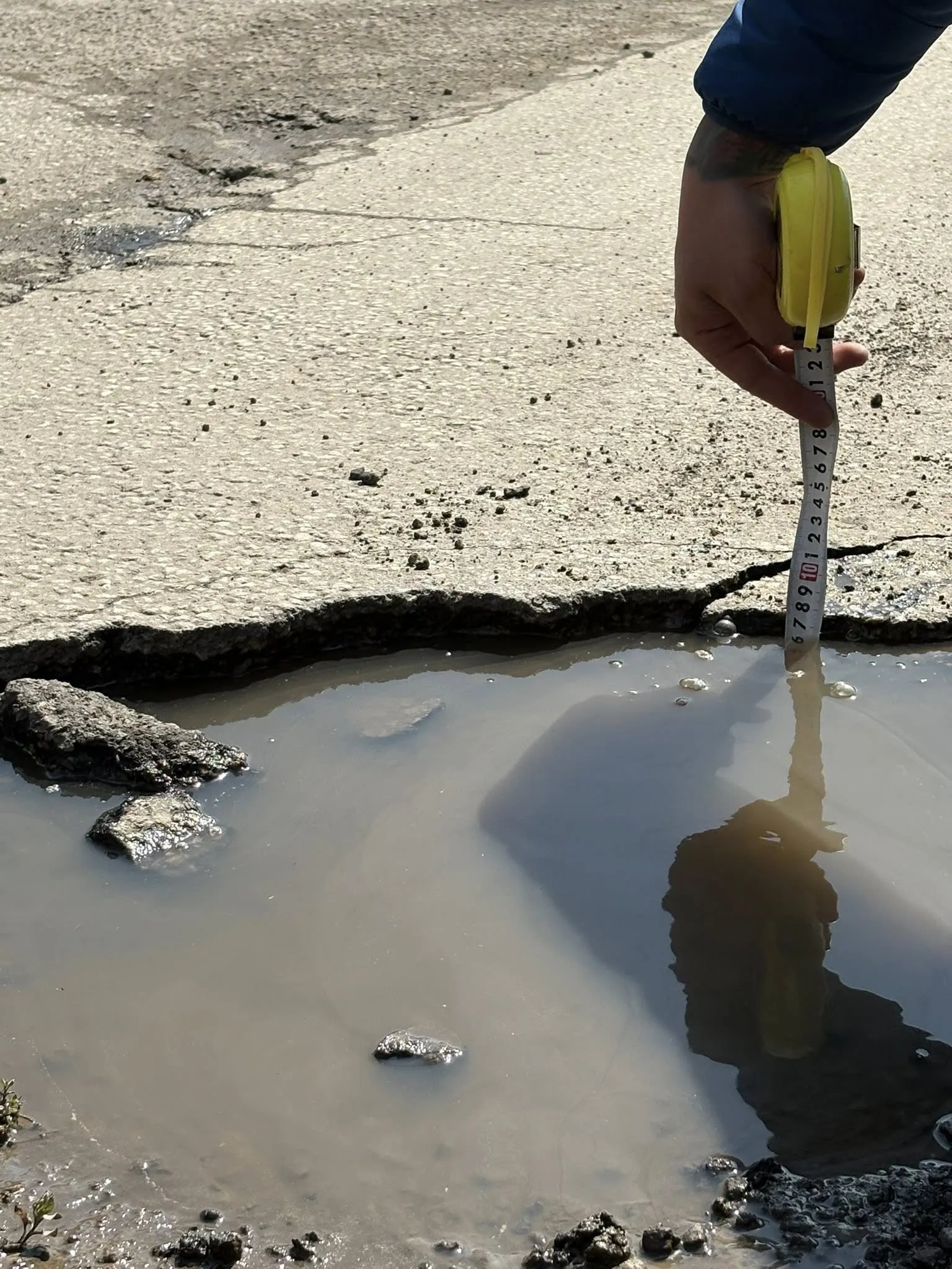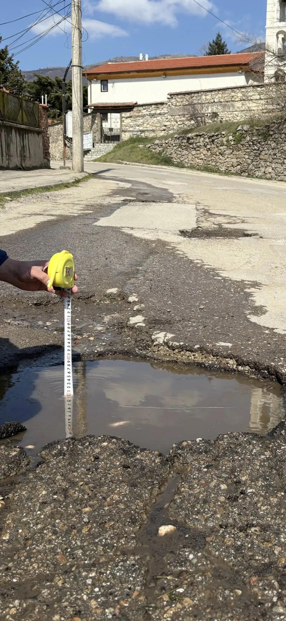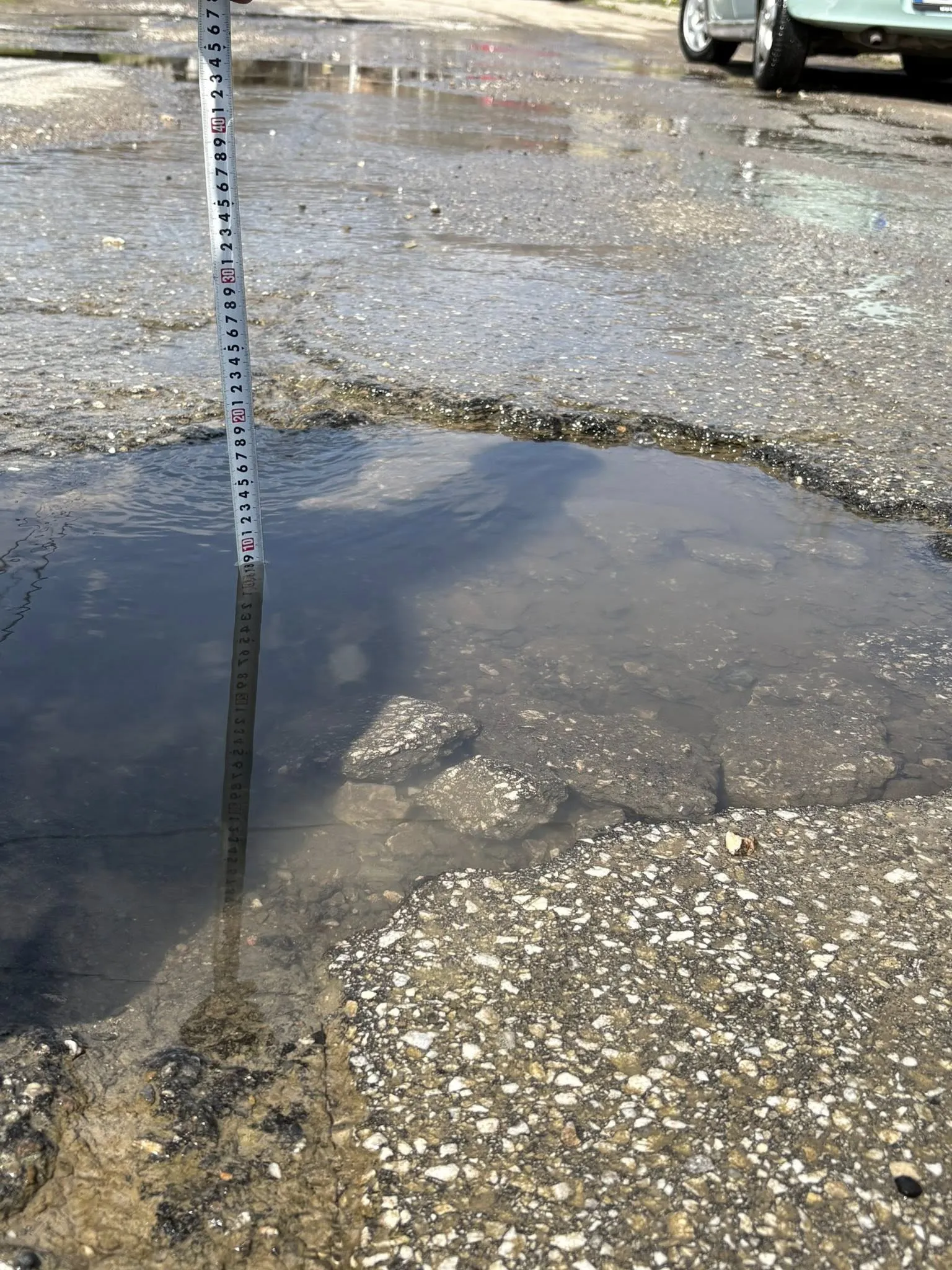 За да докажат мащаба на проблема, жителите на „Сушица“ са използвали ролетка, с която са измерили дълбочината на неравностите. Снимките показват, че на места дупките достигат близо 10 см дълбочина.
