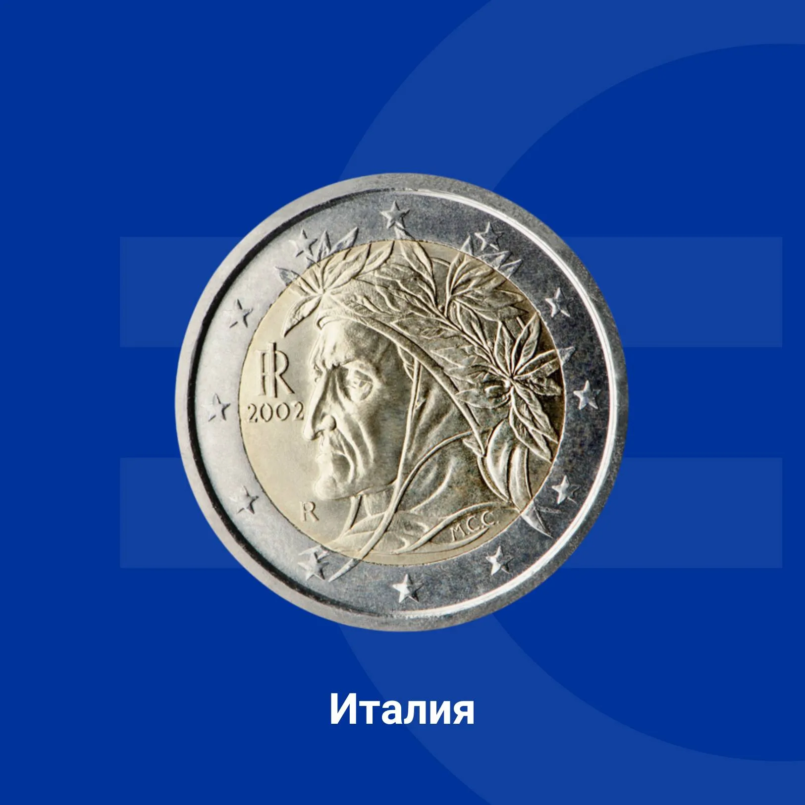 На монетата от 2 евро е изобразен портрет на Данте Алигиери от Рафаело, който се съхранява във Ватиканския дворец в крилото на папа Юлий II.