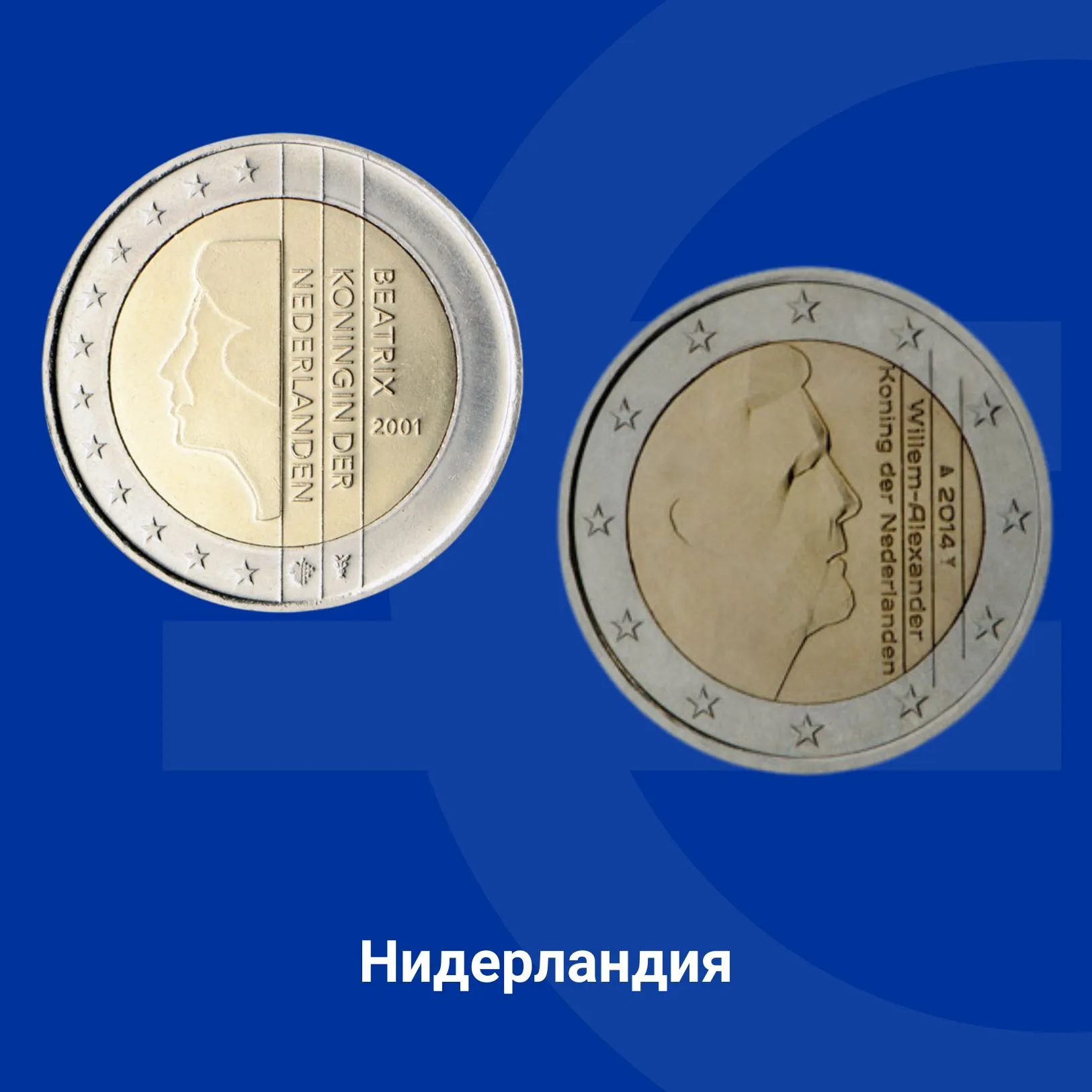 На монетата от 2 евро в първата серия е изобразен портрет на кралица Беатрикс и надпис „Beatrix Koningin der Nederlanden“ (на български - кралица на Нидерландия).