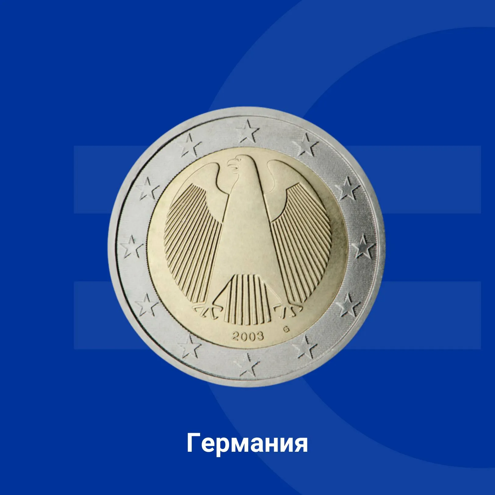 На германската монета от 2 евро е изобразен орел – традиционен символ на суверенитета на страната, ограден от звездите на Европа.
