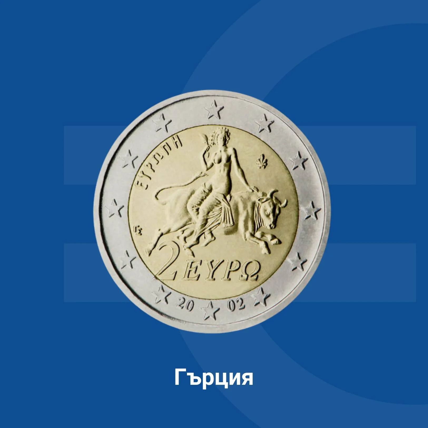 На гръцката монета от 2 евро е изобразен фрагмент от мозайка в Спарта (3 век сл. Хр.), представящ отвличането на Европа от приелия образа на бик Зевс. Европа е героиня от гръцката митология, дала името на континента.