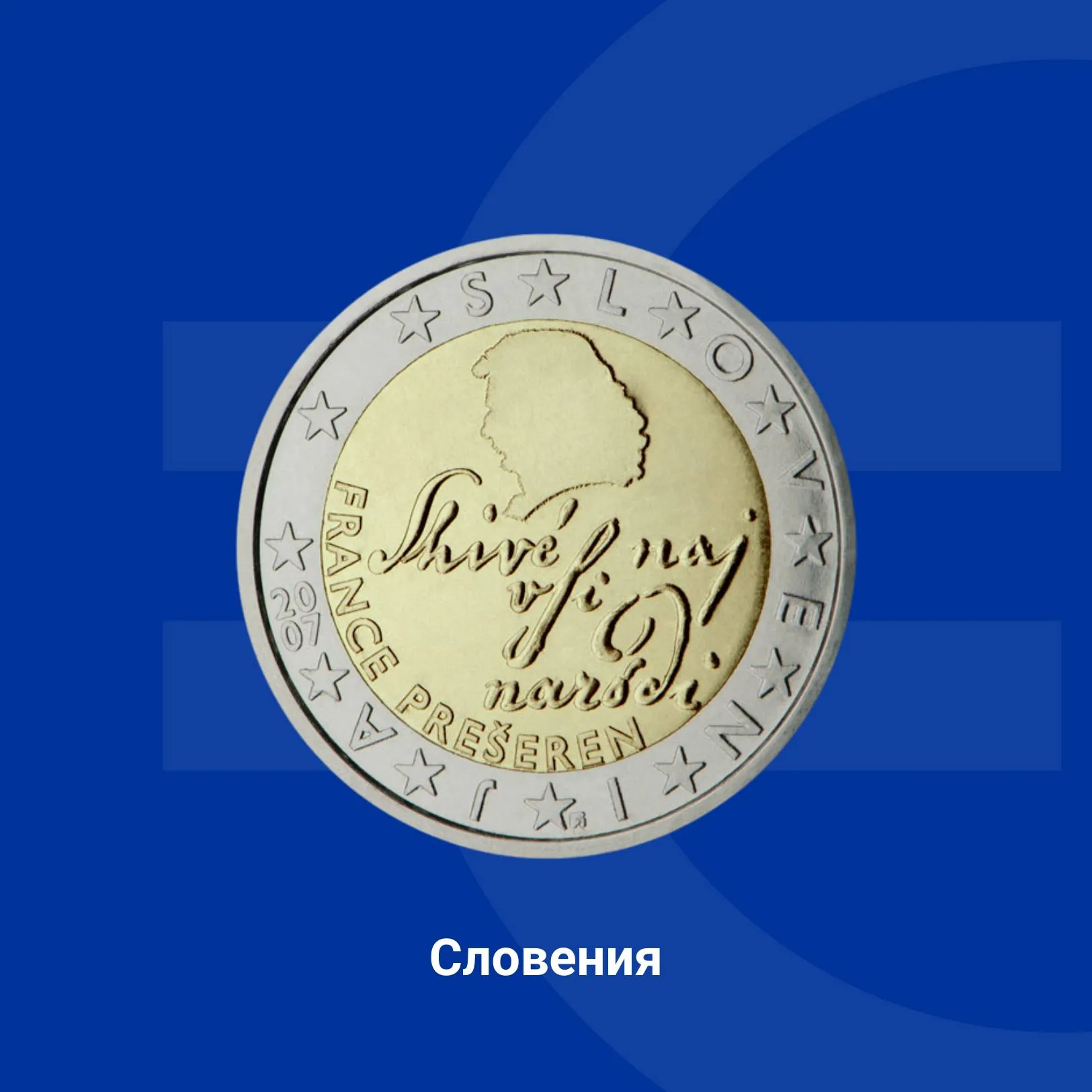 На словенската монета от 2 евро е изобразен поетът Франце Прешерн и стих от неговото стихотворение „Zdravljica“, използвано и за националния химн – „Shivé naj vsi naródi“ ( на български - "Бог да благослови всички народи").