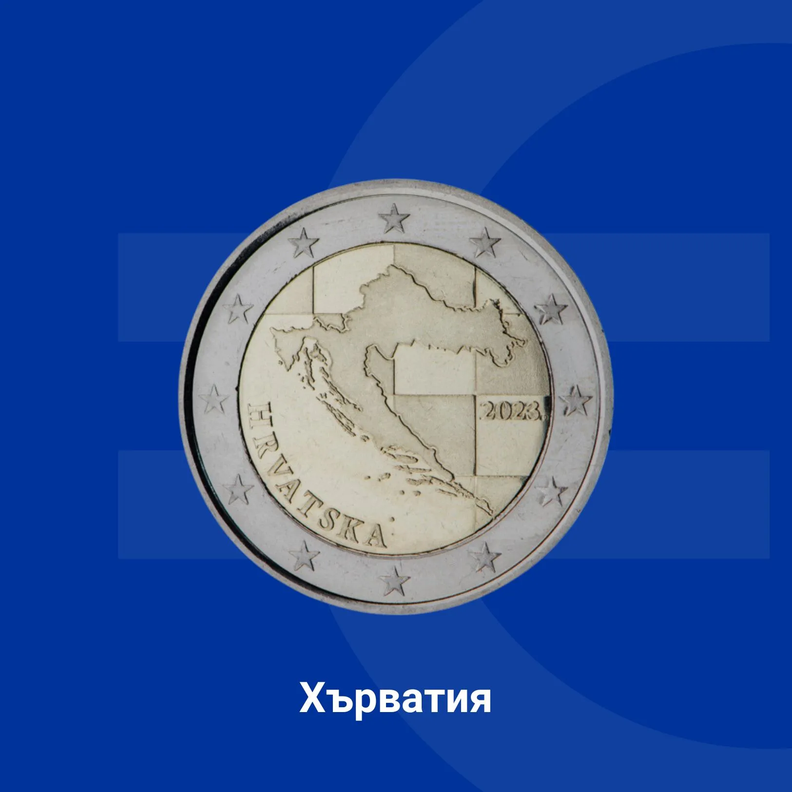 На хърватската монета от 2 евро е изобразена карта на Хърватия на фона на шахматен десен. Дизайнът включва също годината на емитиране, надписът „HRVATSKA“, както и 12-те звезди на европейското знаме.