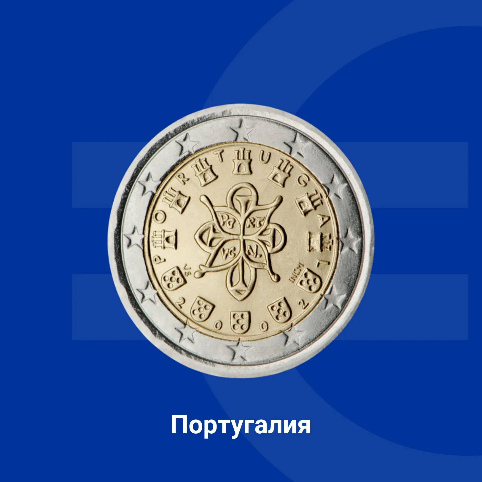 На португалската монетата от 2 евро са изобразени седем замъка и пет герба на Португалия, оградени от 12-те звезди на Европейския съюз. В средата е разположен кралският печат от 1144 г. на първия крал на страната - Афонсу Енрикеш.