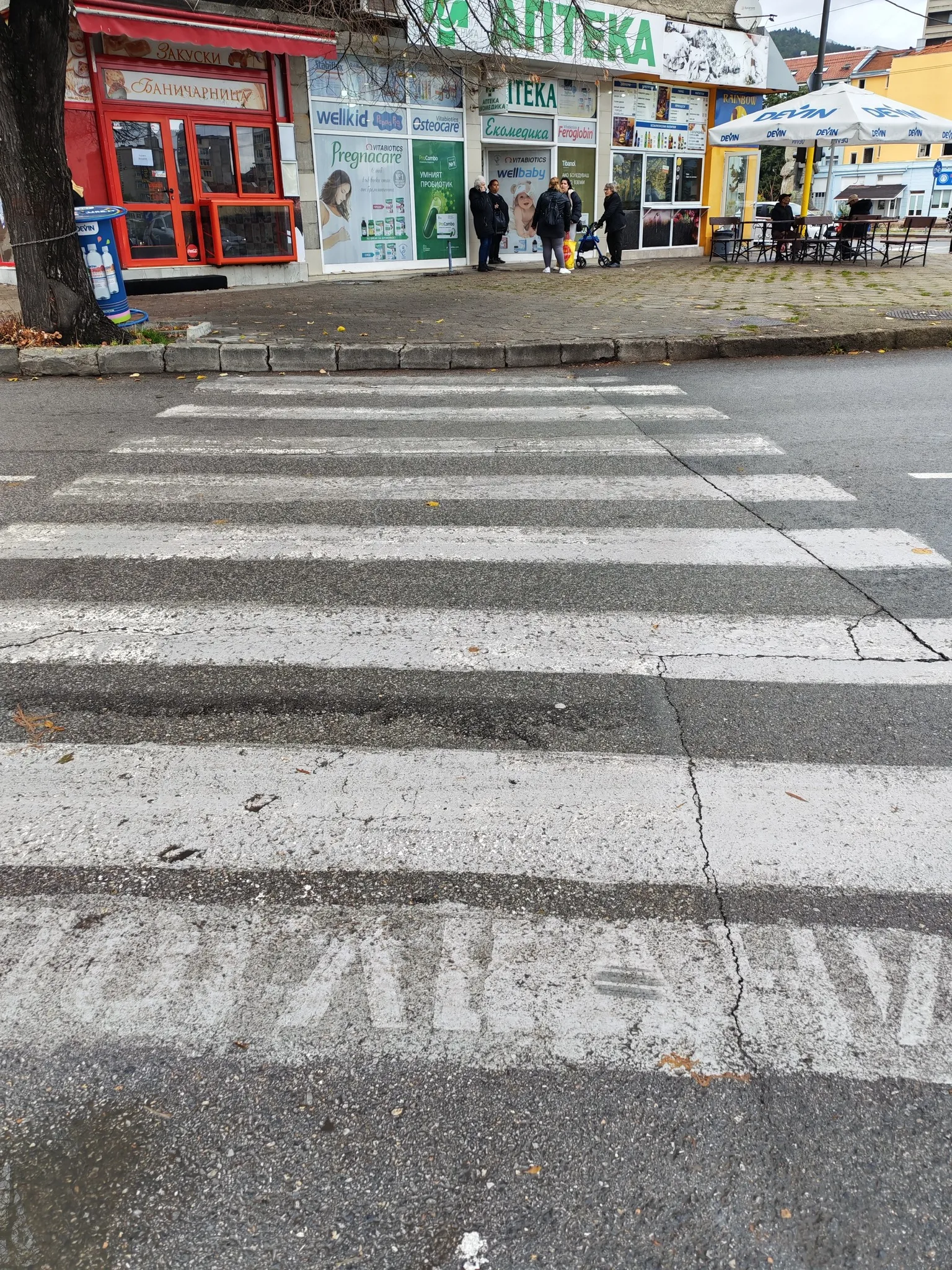 С други думи – пешеходците трябва да приемат, че сивите, напукани остатъци от боя, широки по 30 см, не са маркировка, а случайно художествено петно, оставено от времето. Някакъв вид асфалтова пещерна живопис.