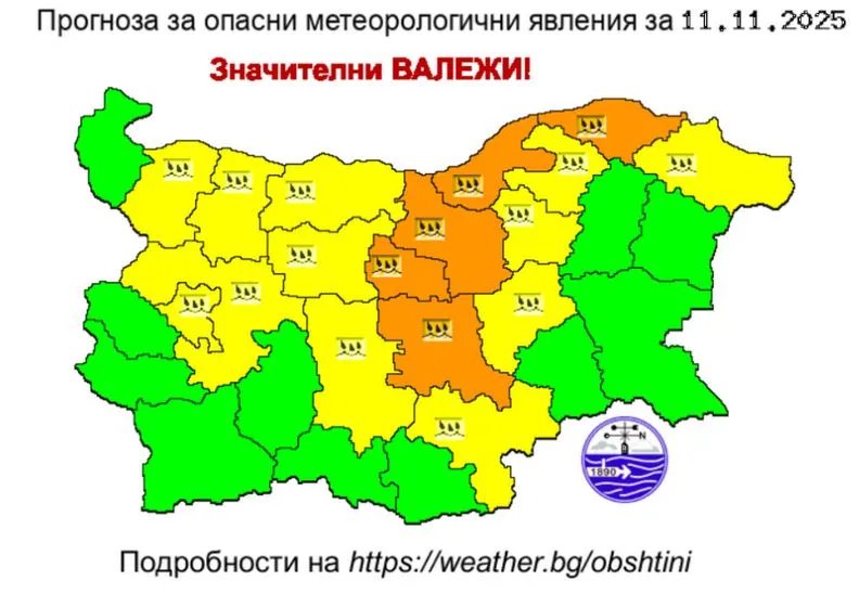 За 11 ноември е обявен оранжев и жълт код за значителни валежи. Предупреждението е в сила за 17 области в страната. В областите Силистра, Русе, Стара Загора, Габрово и Пловдив е обявен предупредителен оранжев код за опасно време. За останалите 12 области е в сила жълт код за потенциално опасно време. Това са областите Добрич, Разград, Търговище, Сливен, Хасково, Пловдив, Ловеч, Плевен, Враца, Монтана, София-град и София област.