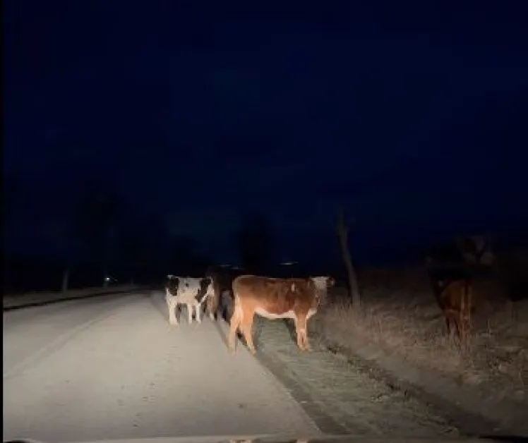 За поредния случай сигнализира Милена Андонова в социалните мрежи. Тя алармира за крави, излезли частично на пътното платно, които застрашават както шофьорите, така и самите животни. Дамата споделя и кадри на животните.