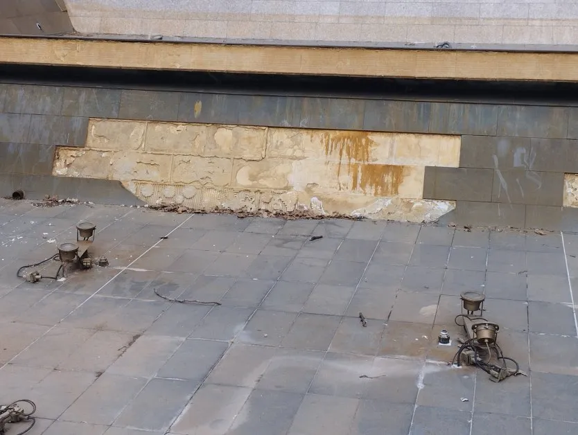 Снимките разкриват паднала и разместена облицовка, оголена основа и компрометирани участъци. На места се виждат отчупени елементи и разронена конструкция, което създава усещане за занемареност и липса на поддръжка. Част от стените са с липсващи плочи, а по пода личат следи от влага и замърсяване.