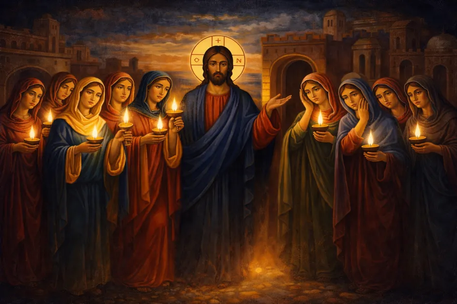 Според нея десет девици очакват младоженеца. Пет от тях са мъдри и носят масло за светилниците си, а другите пет – не. Когато младоженецът идва неочаквано през нощта, само подготвените са готови да го посрещнат. Останалите остават извън празника.