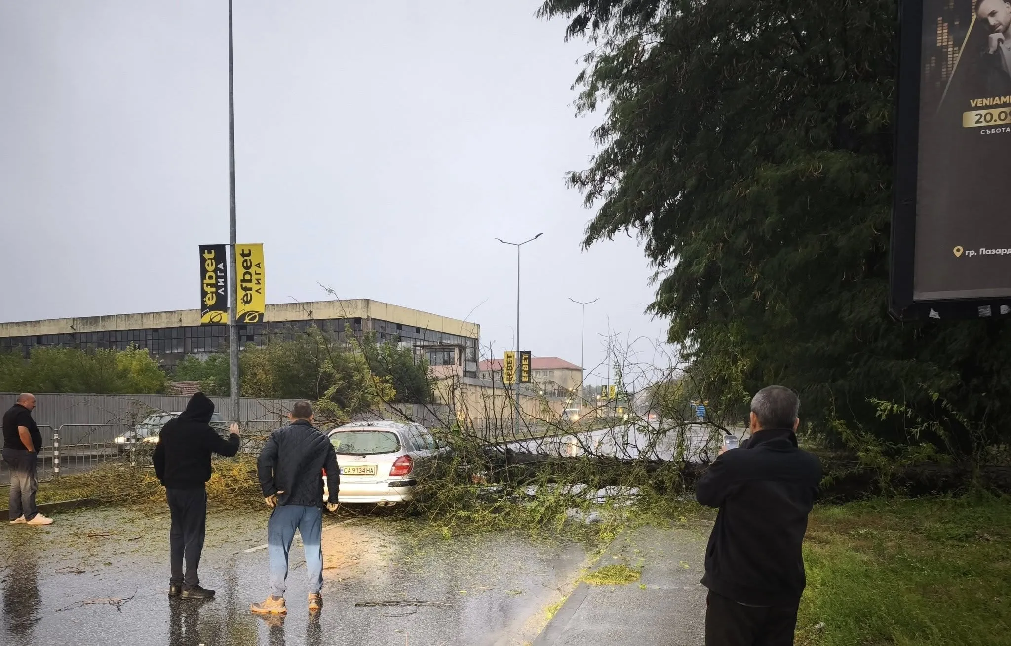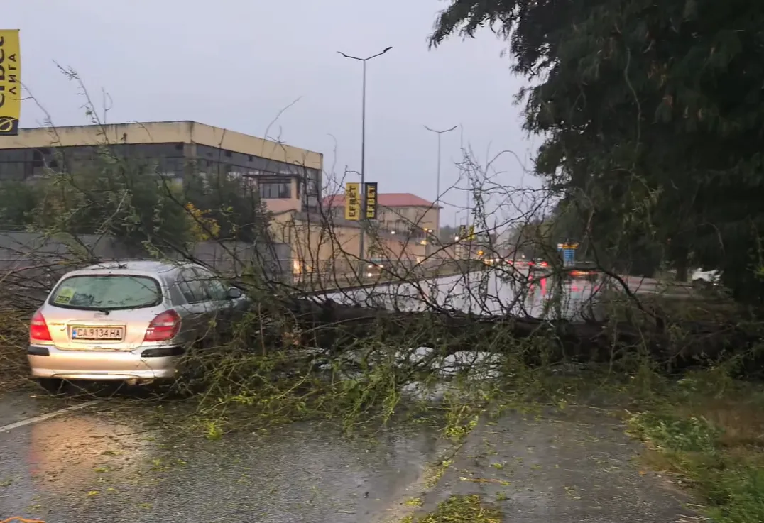 Силен вятър и проливен дъжд в Пазарджик доведоха до инцидент, при който дърво падна върху лек автомобил на входа на града, по пъът II-37. Според очевидец в колата е имало и бебе.