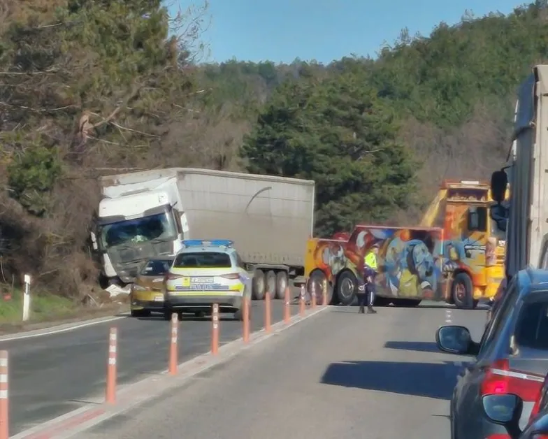 Камион е катастрофирал и се е озовал в крайпътната канавка. Произшествието е в района на така наречения Беленски баир.